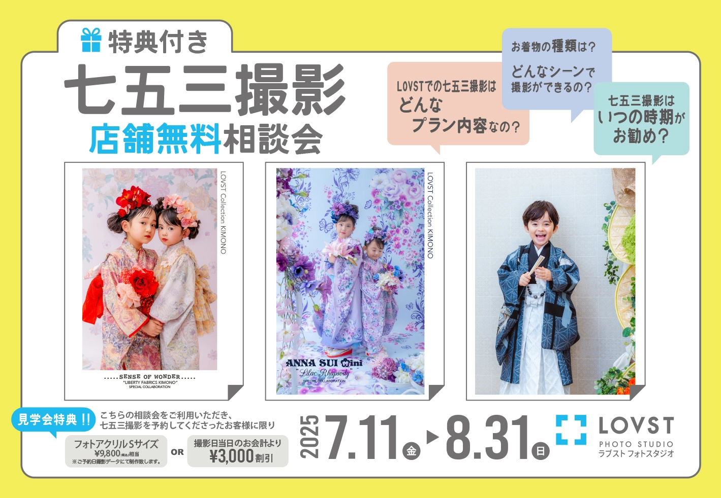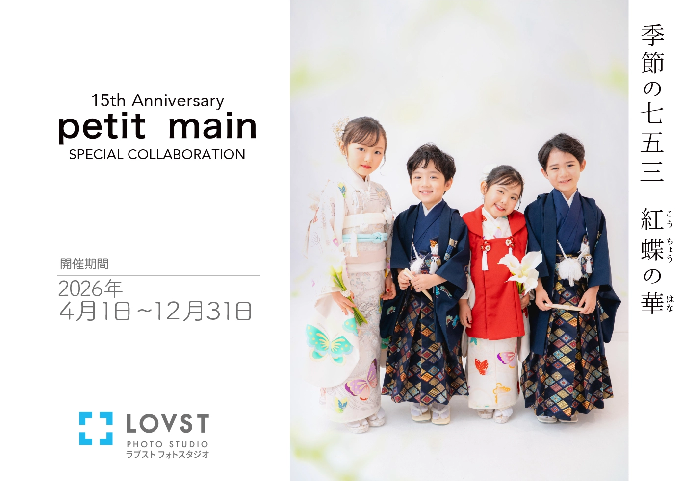 七五三・誕生日・入園入学・卒園卒業などの大切な記念日に、今しか残せない瞬間の愛おしさを切り取ります。フォトスタジオのために制作したナルミヤのオリジナルドレスや着物を多数用意し、”新感覚の写真撮影”をご提供します。