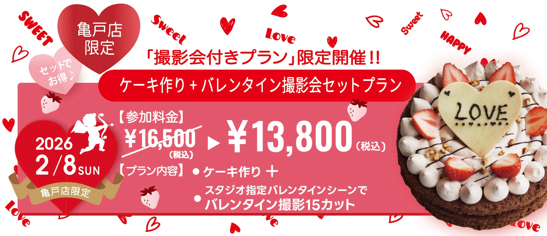 ◆ケーキ作り体験会後、LOVST亀戸店スタジオでバレンタイン撮影会のご案内となります。混雑時は、撮影まで少々お時間をいただく場合がございます。