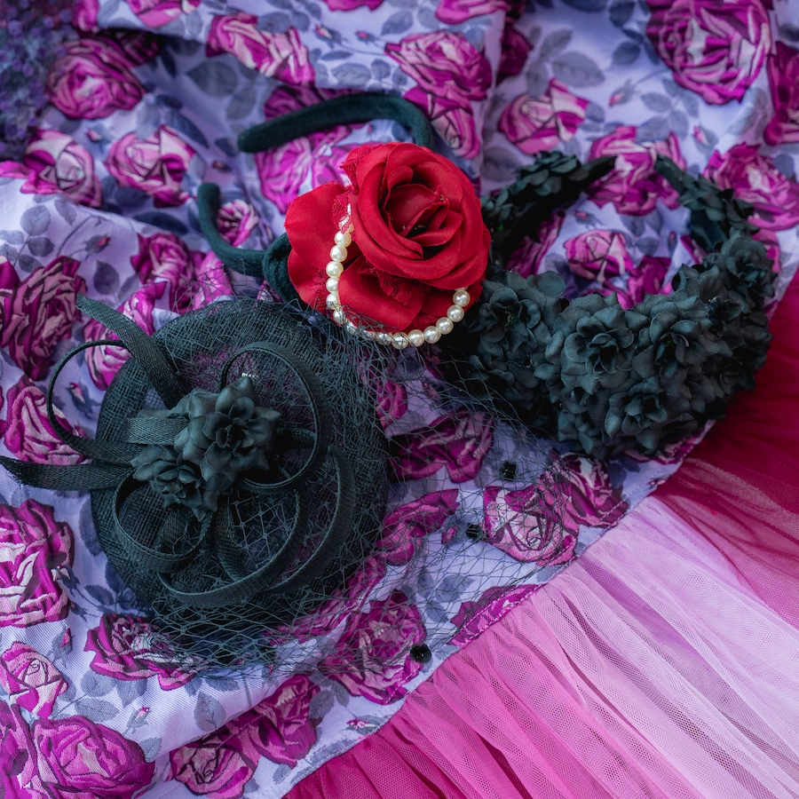◆ヘアアクセサリーは3種類(カクテルハット、赤ローズカチューシャ、黒フラワーカチューシャ)からお選びいただけます
