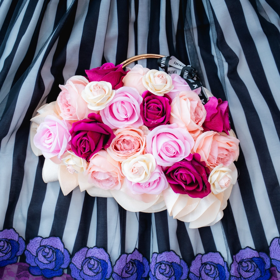 ◆たくさんのバラが咲き誇るバッグは持ち手のゴールドがアクセントに。装いに華やかさをプラスします(バッグは2個のご用意がございます)