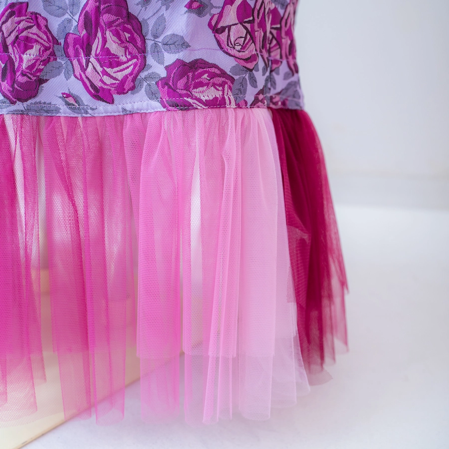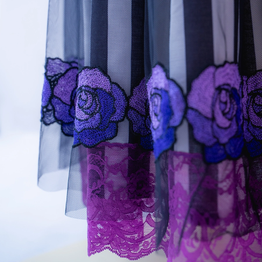 ◆チュール素材にバラの刺しゅうを施した華やかな裾デザイン