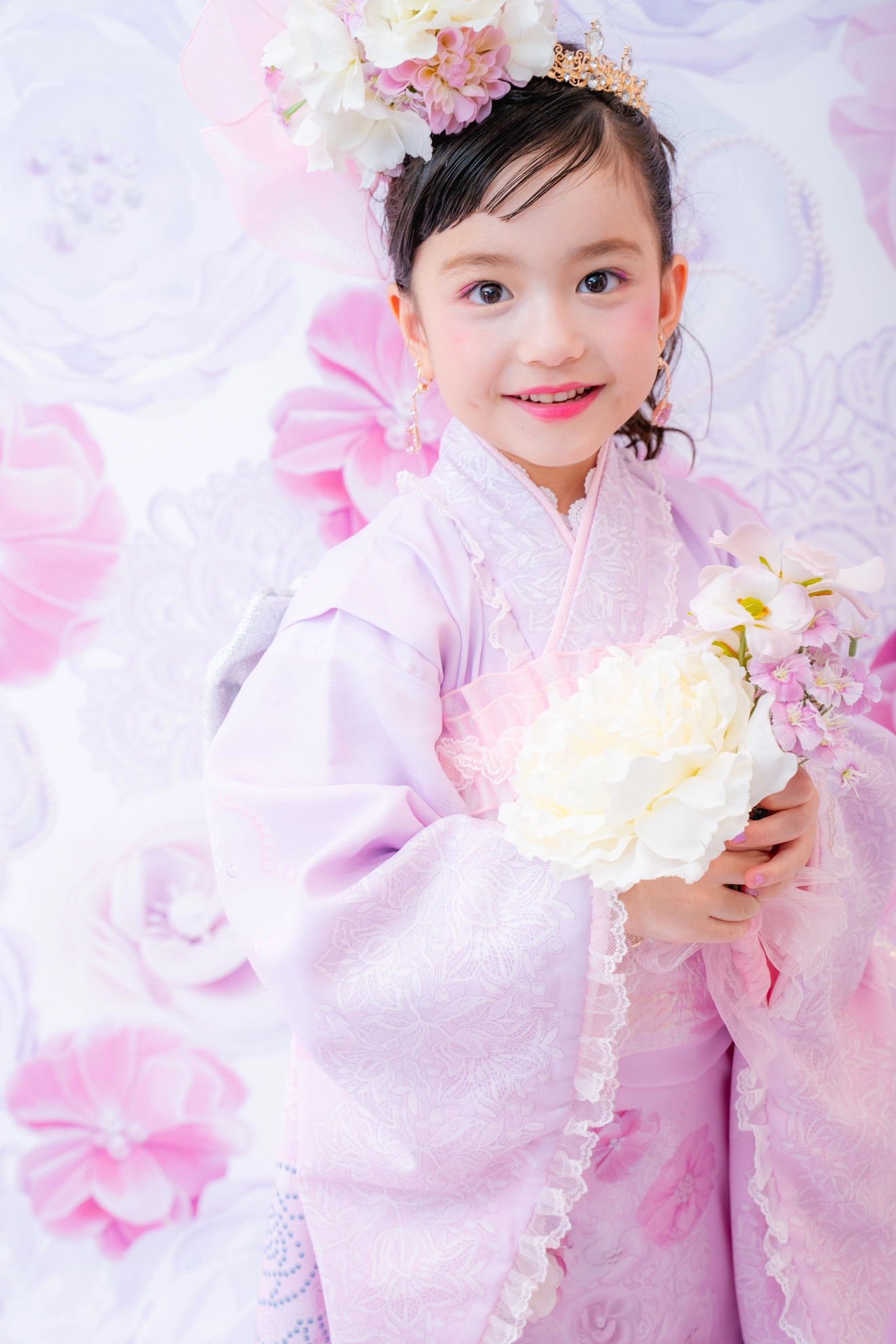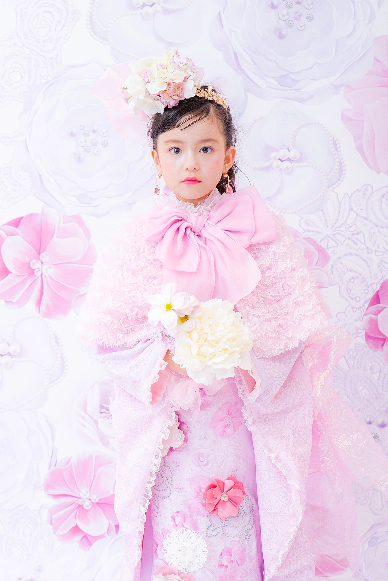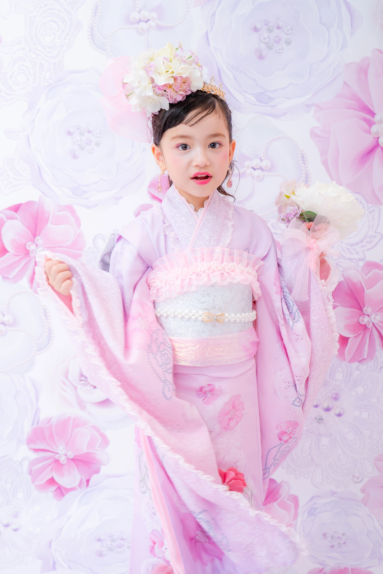 7歳モデルが着用しているメゾ ピアノ着物(7歳)フローラルエレガンス(衣装番号63008)