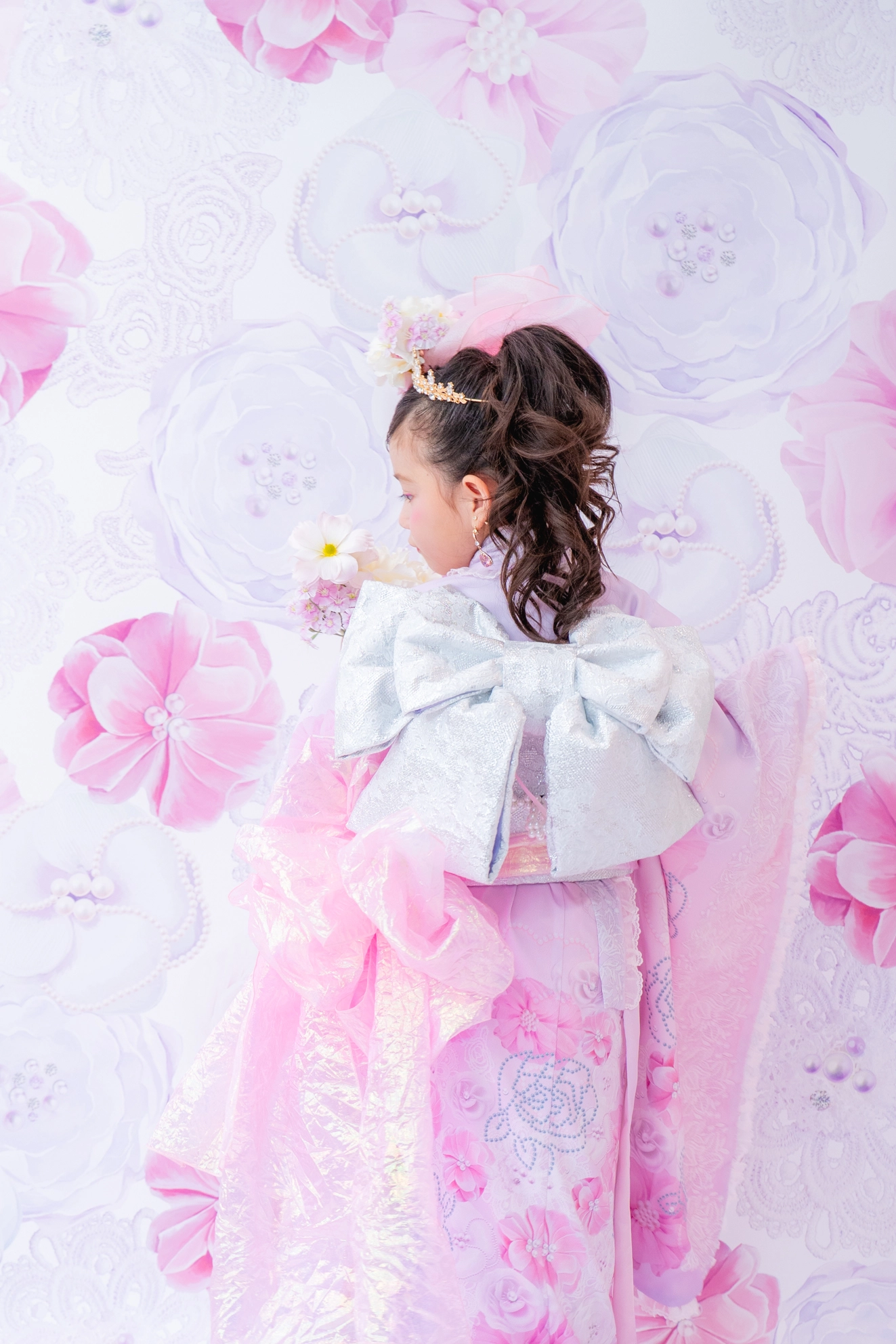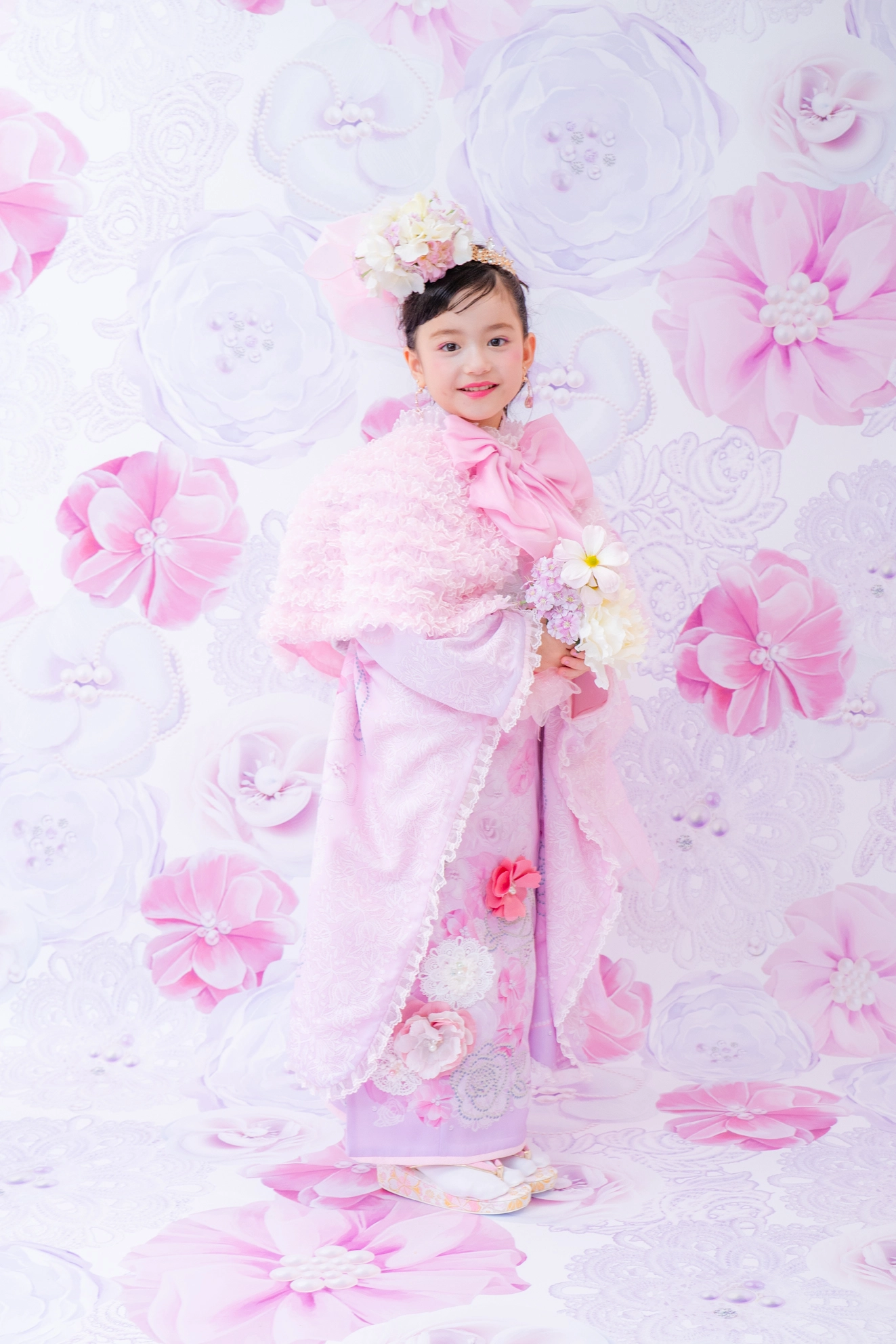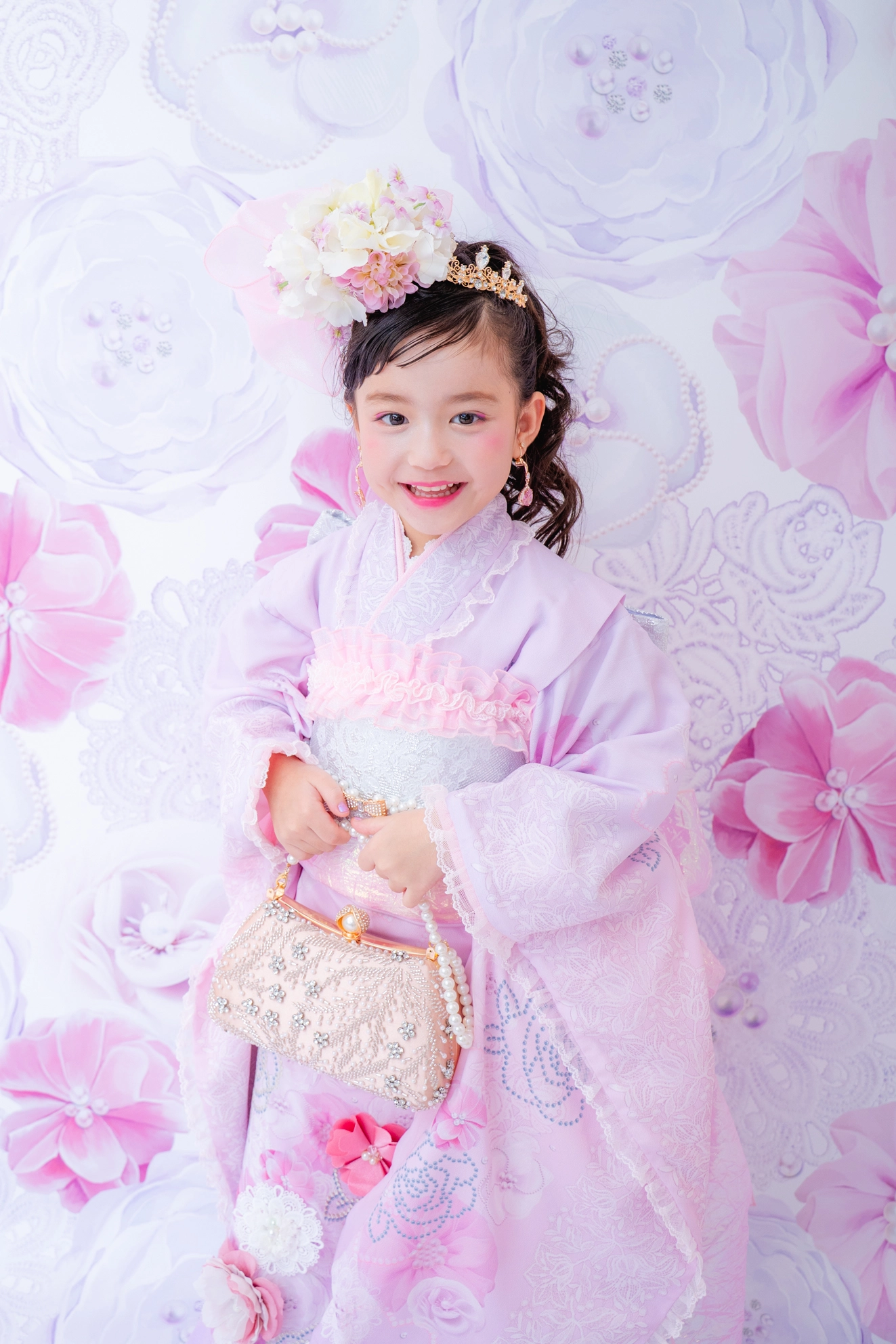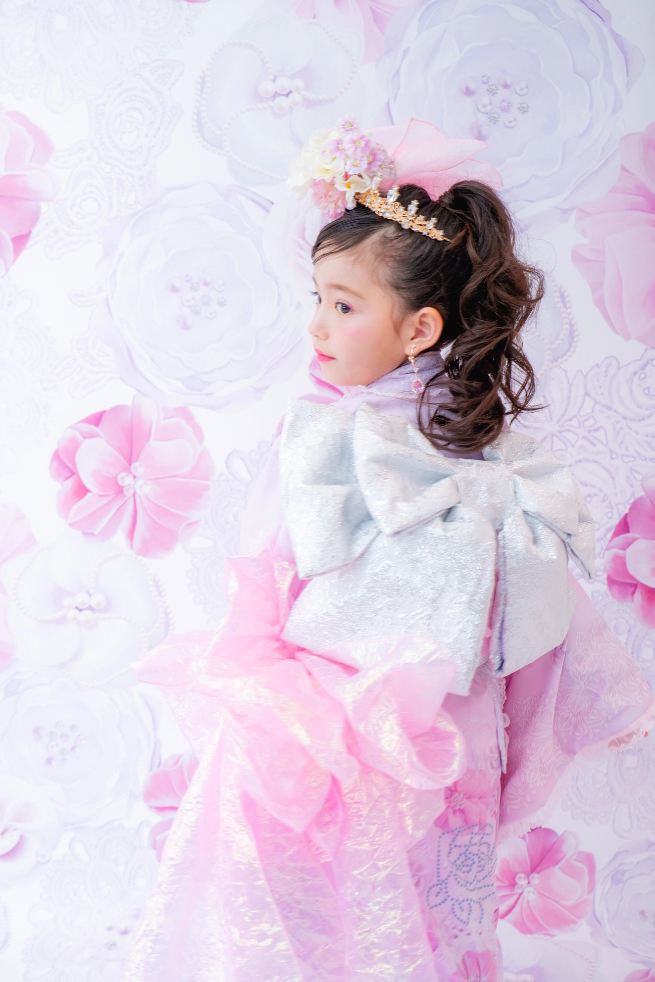 7歳モデルが着用しているメゾ ピアノ着物(7歳)フローラルエレガンス(衣装番号63008)