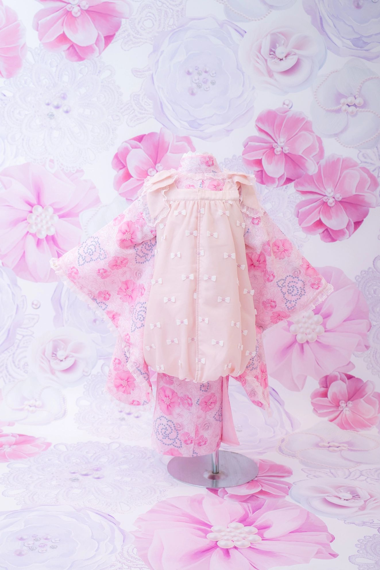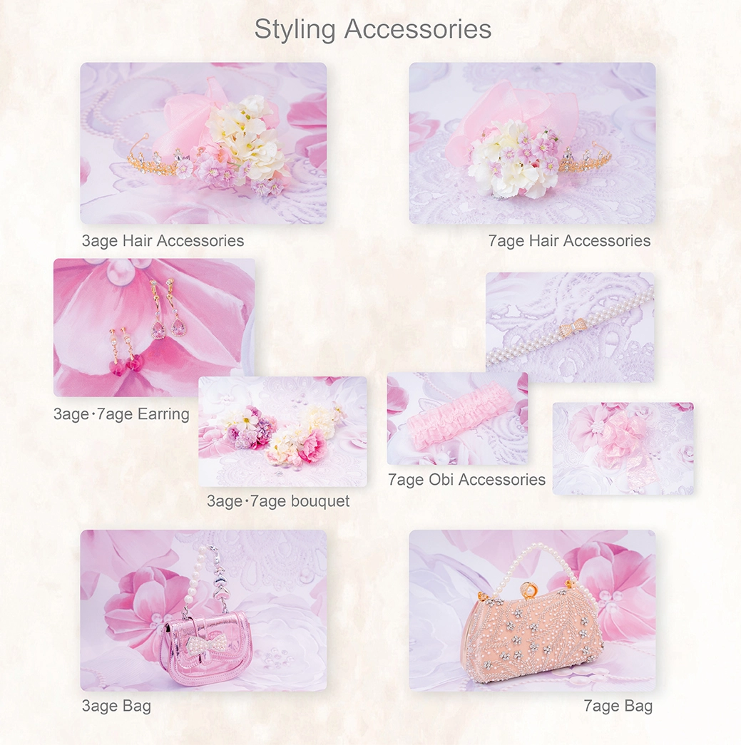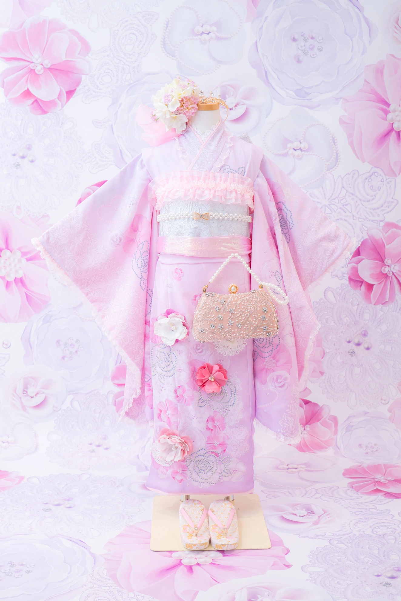 フリル帯飾りやパール帯留めなどの小物と合わせ、