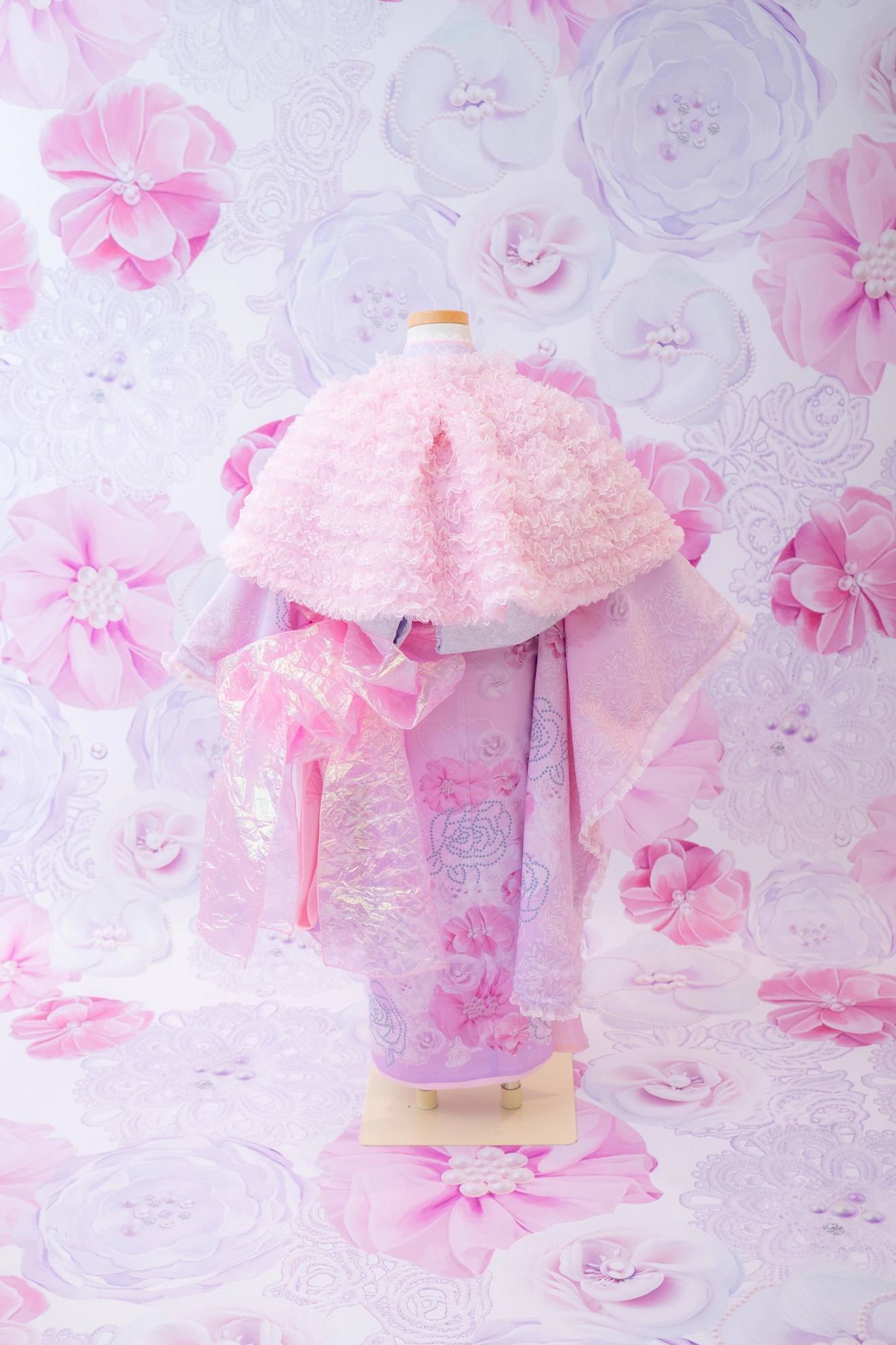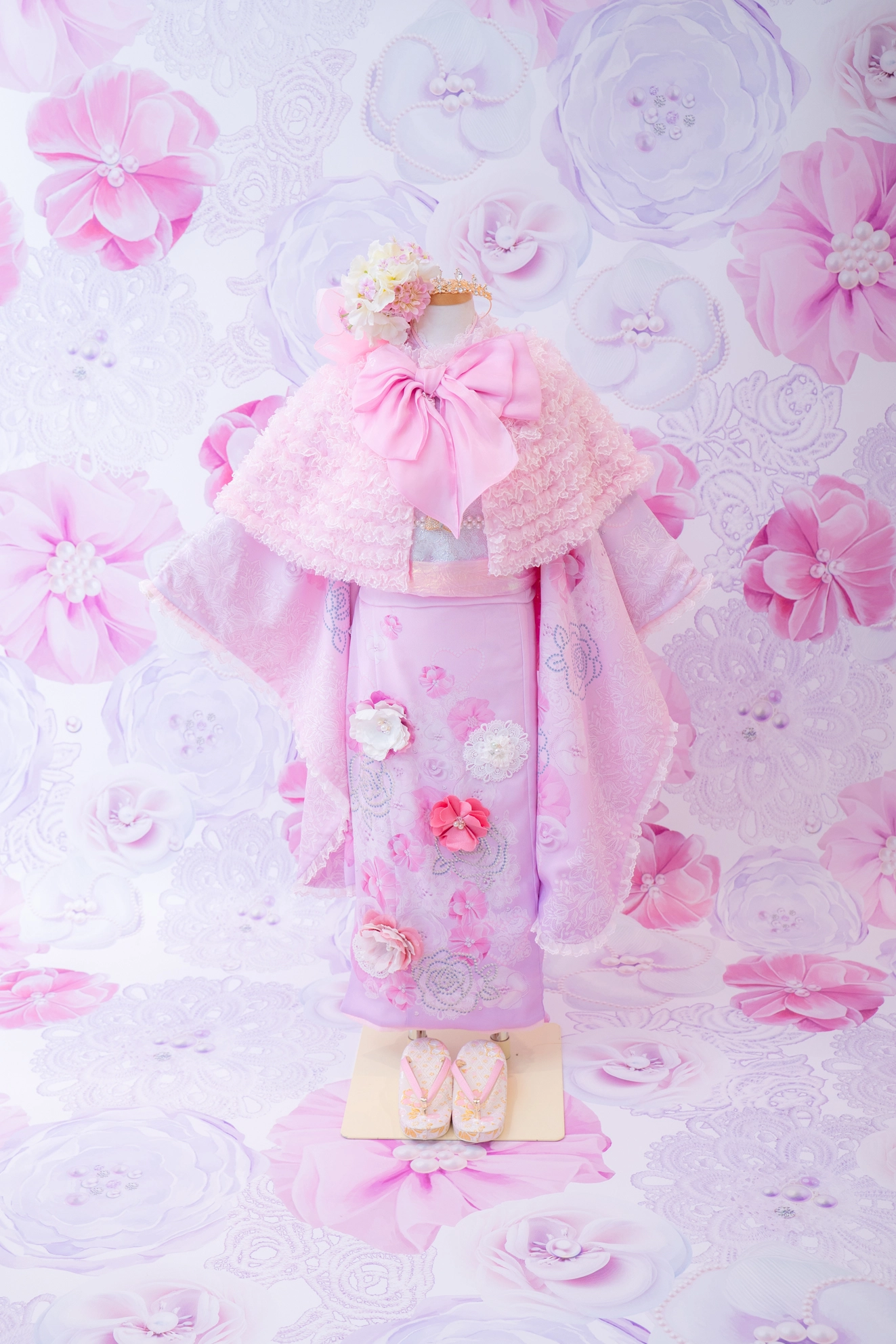 および3歳モデルが着用しているメゾ ピアノ着物(3歳)ペールスウィート(衣装番号63007)は、開催中の全店舗で着用可能です。