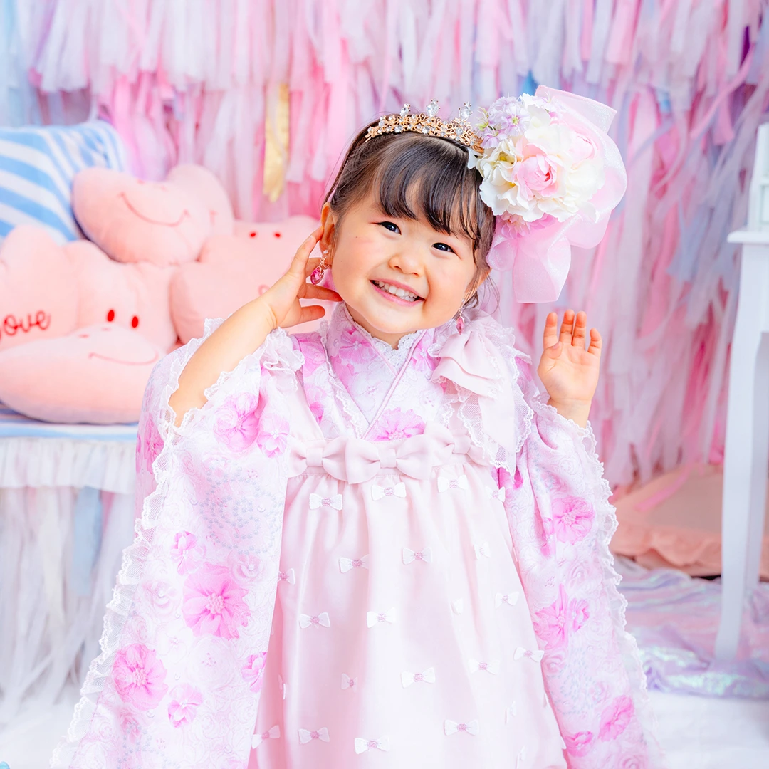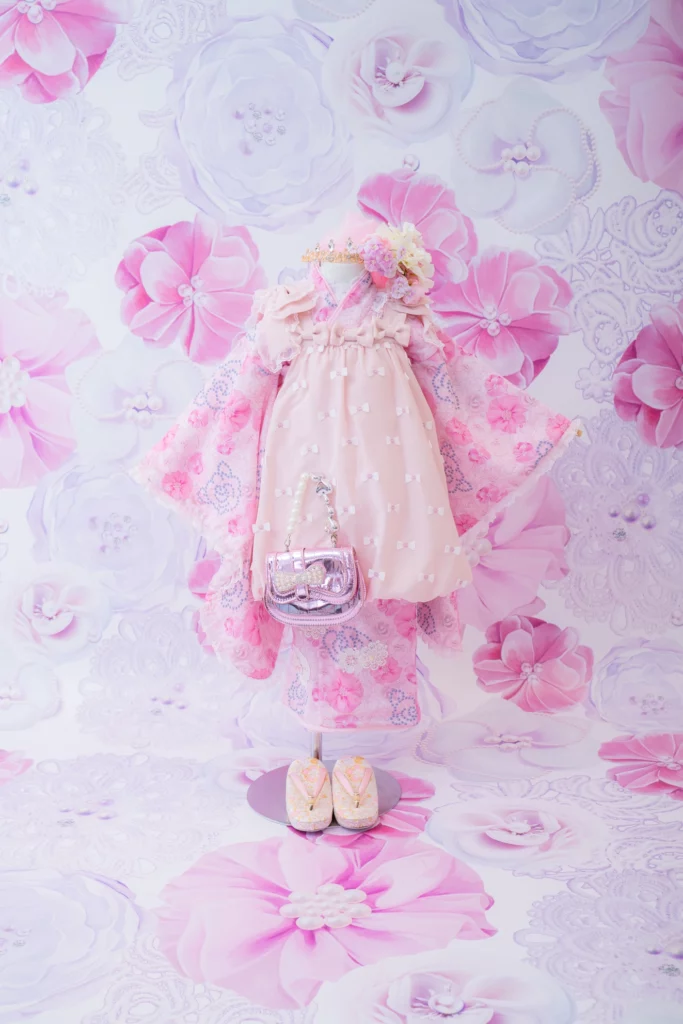 および3歳モデルが着用しているメゾ ピアノ着物(3歳)ペールスウィート(衣装番号63007)は、開催中の全店舗で着用可能です。