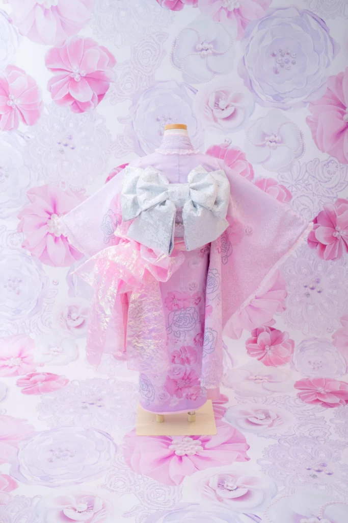 フリル帯飾りやパール帯留めなどの小物と合わせ、