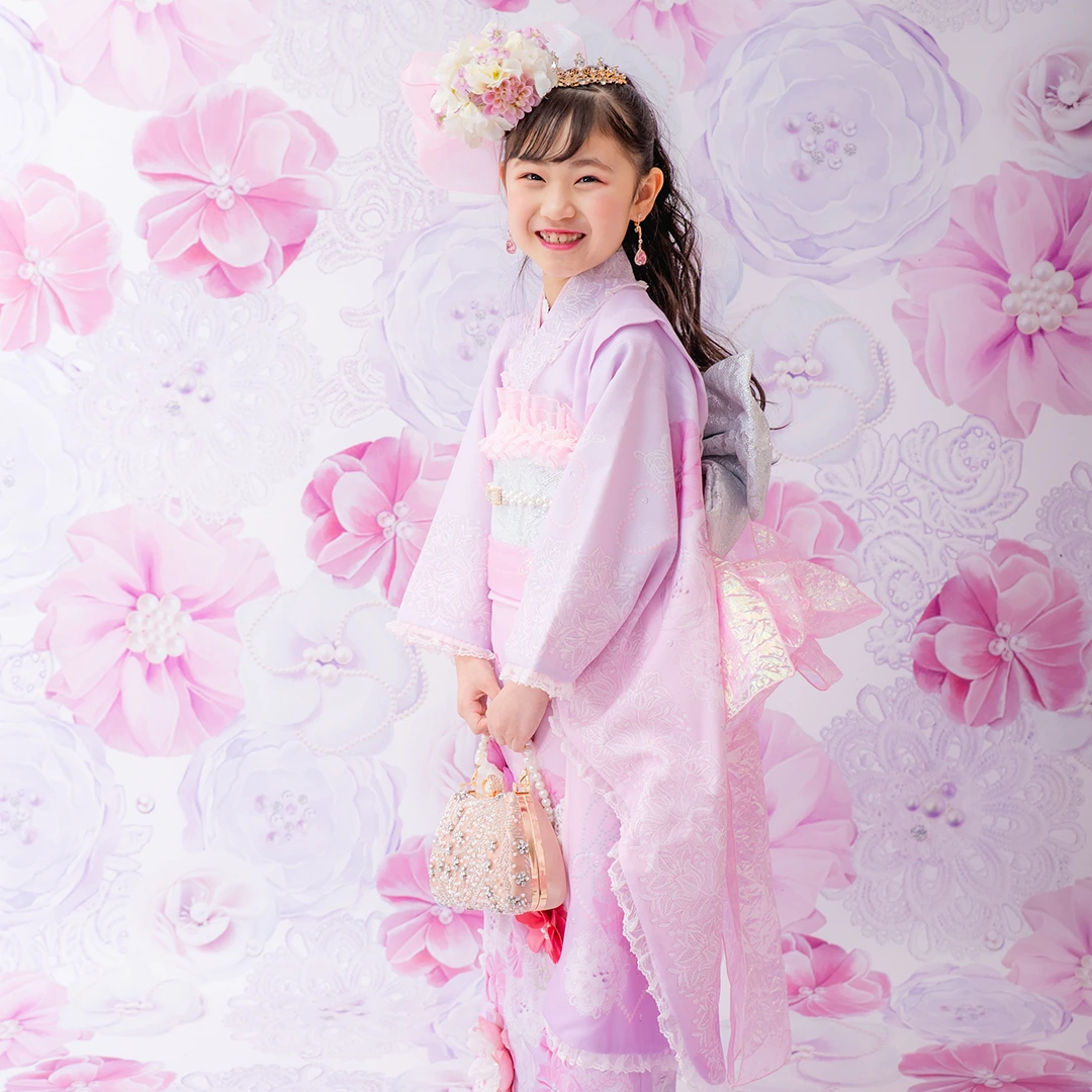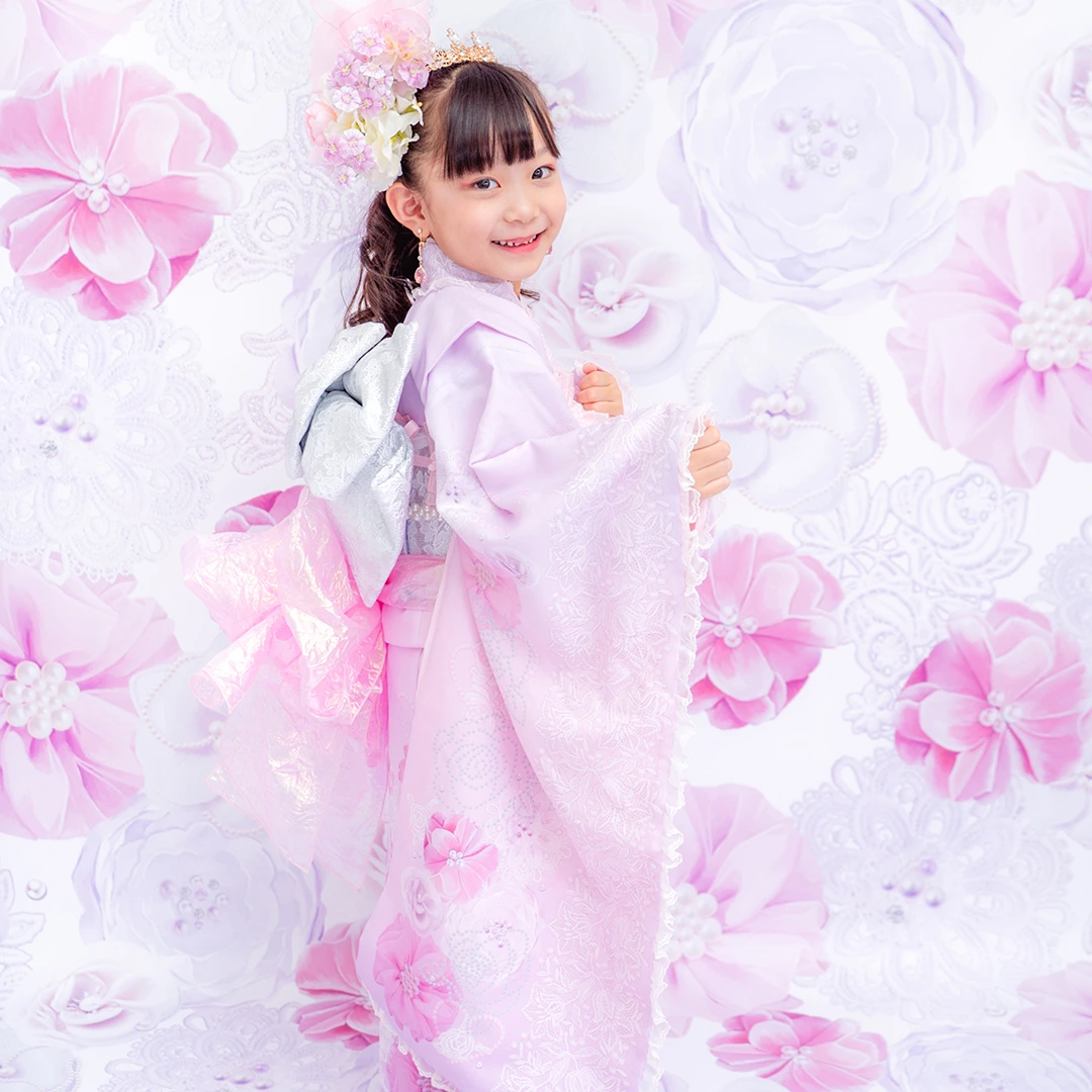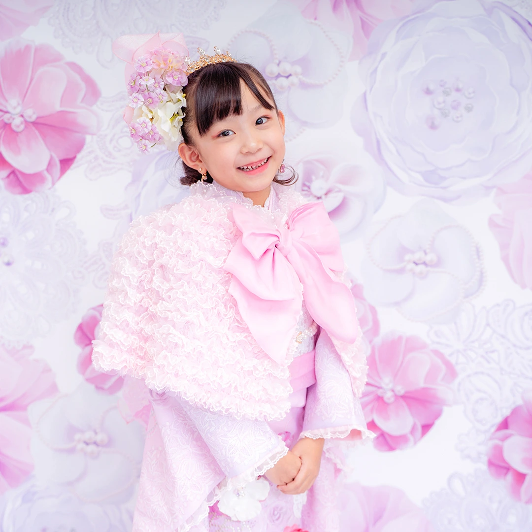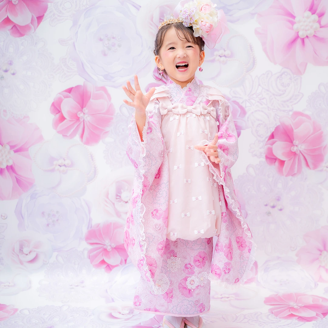 7歳モデルが着用しているメゾ ピアノ着物(7歳)フローラルエレガンス(衣装番号63008)