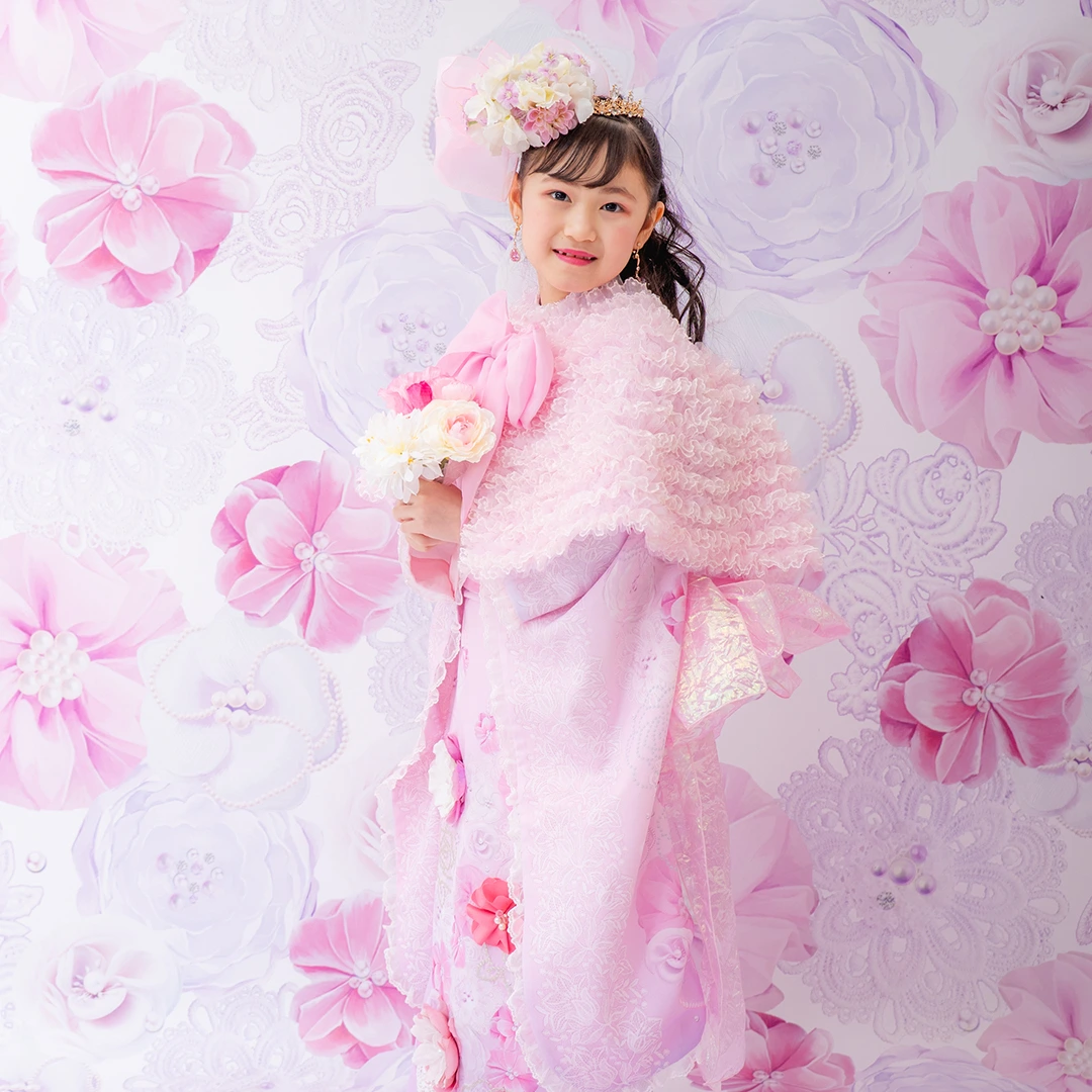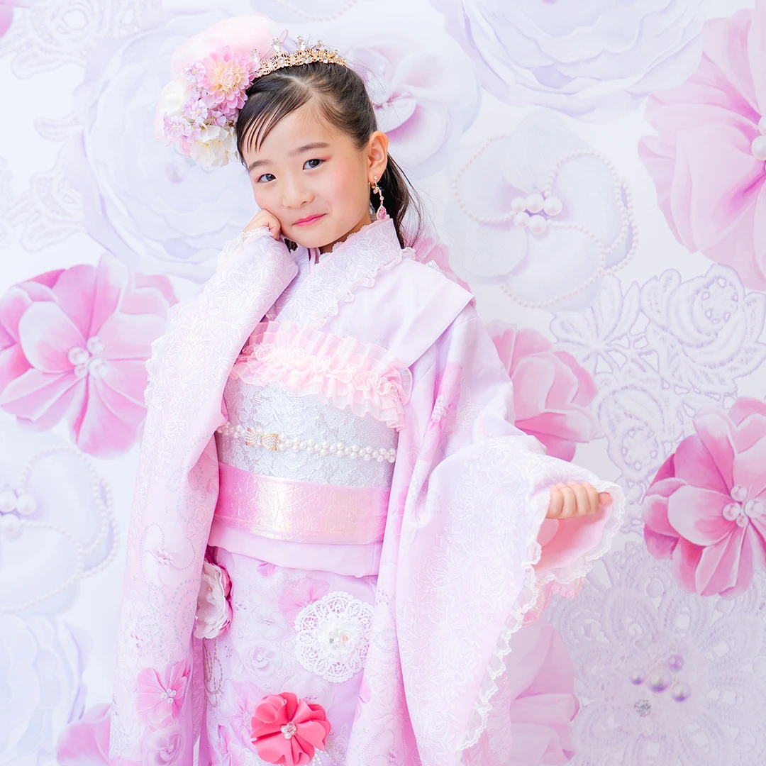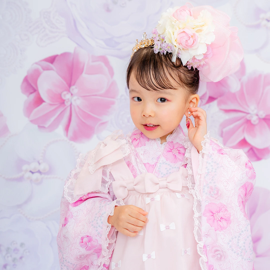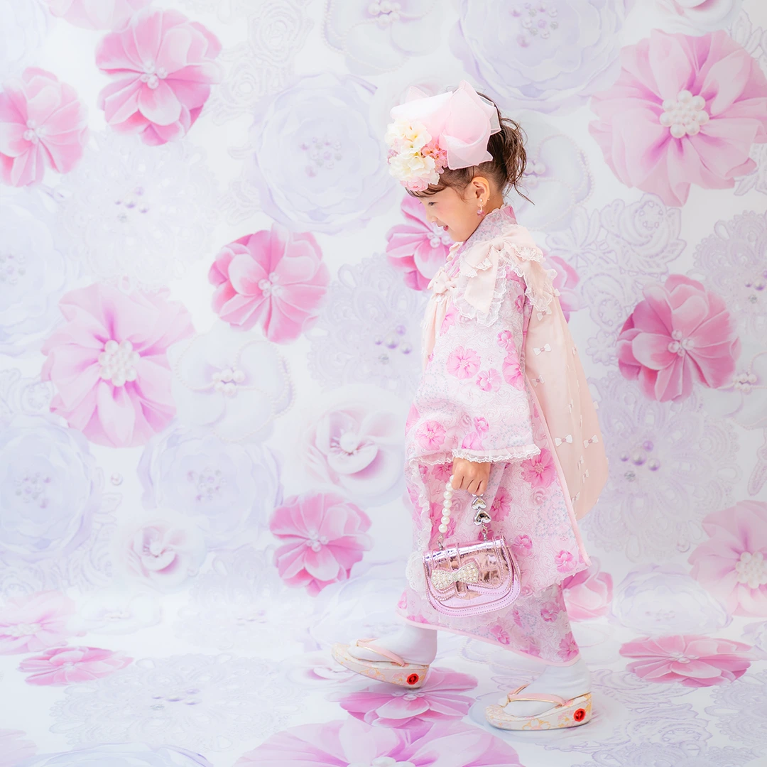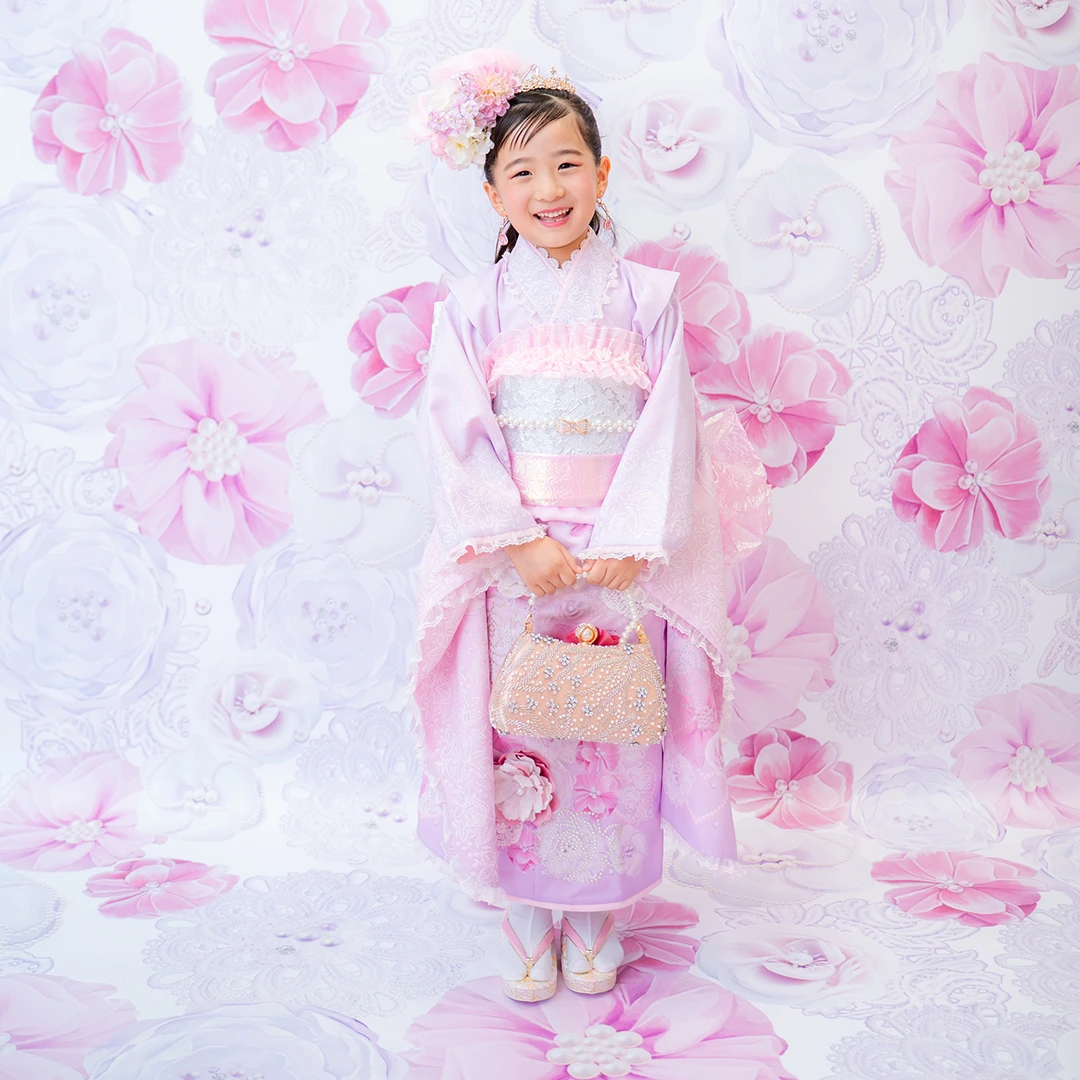 7歳モデルが着用しているメゾ ピアノ着物(7歳)フローラルエレガンス(衣装番号63008)