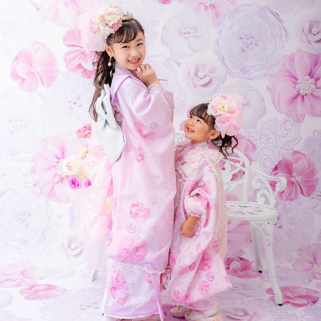 7歳モデルが着用しているメゾ ピアノ着物(7歳) フローラルエレガンス(衣装番号63008)および3歳モデルが着用しているメゾ ピアノ着物(3歳) ペールスウィート(衣装番号63007)は、開催中の全店舗で着用可能です。