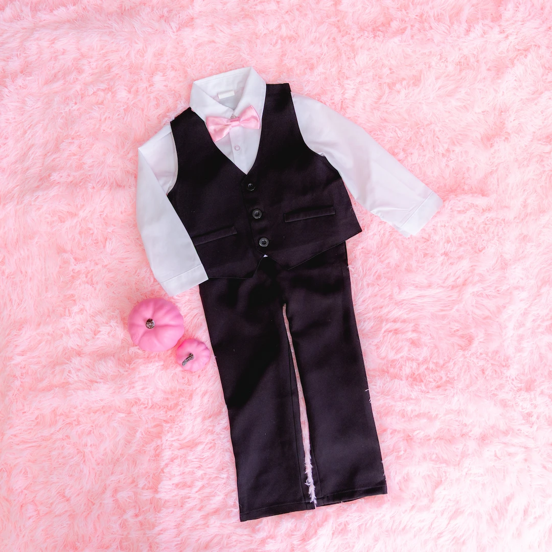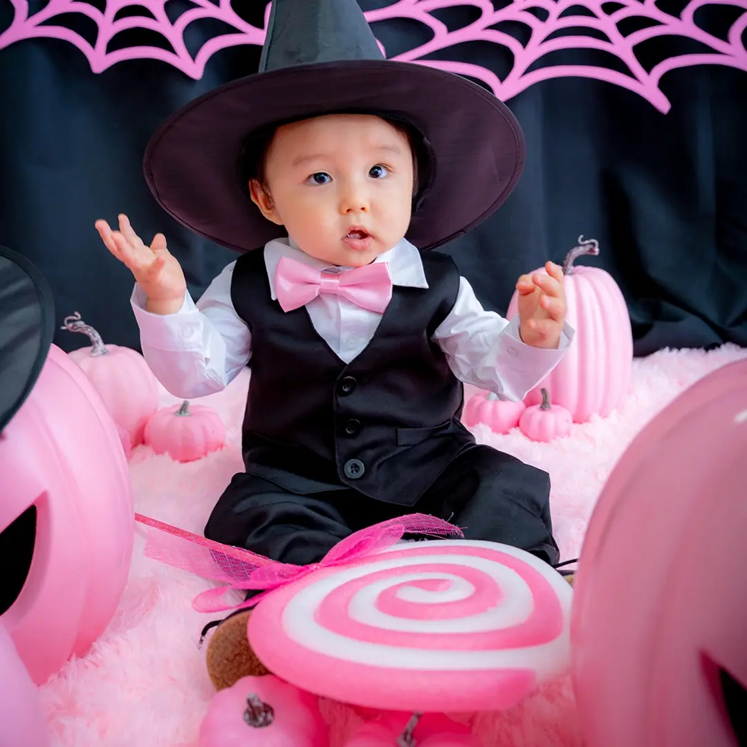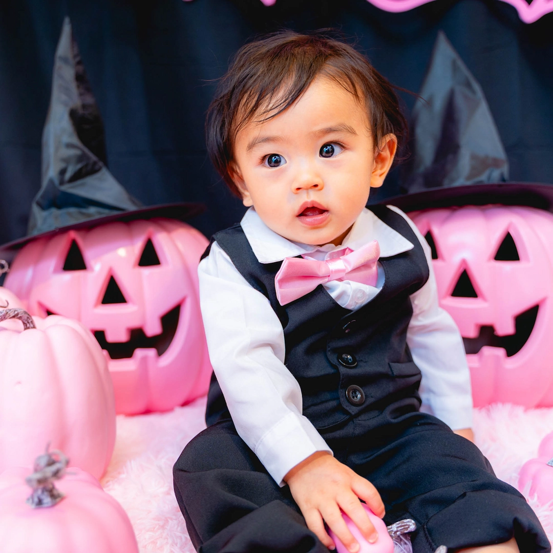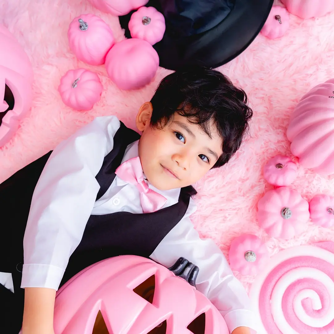 男の子にはピンクの蝶ネクタイが映えるクールなブラックフォーマルをご用意。