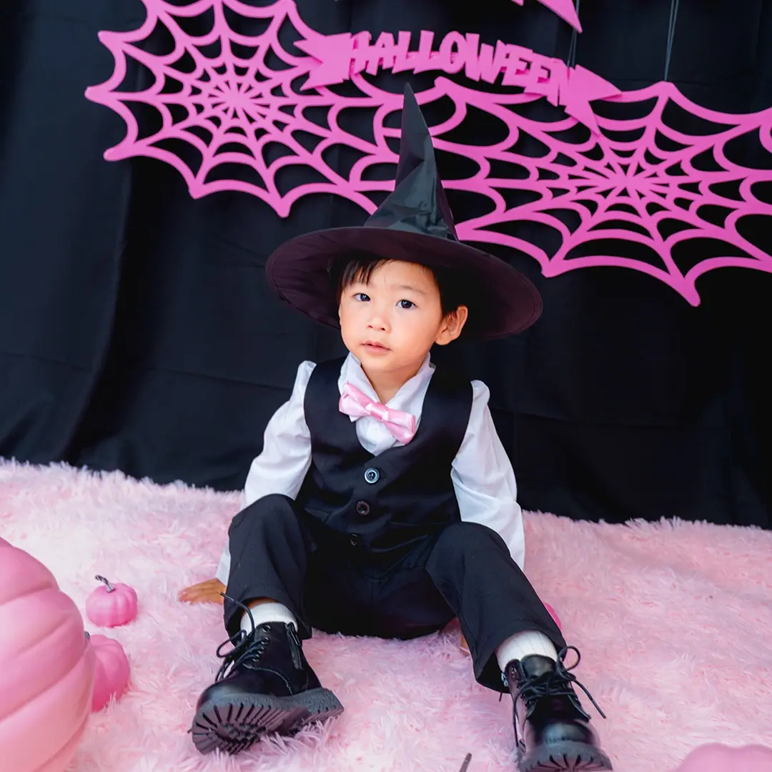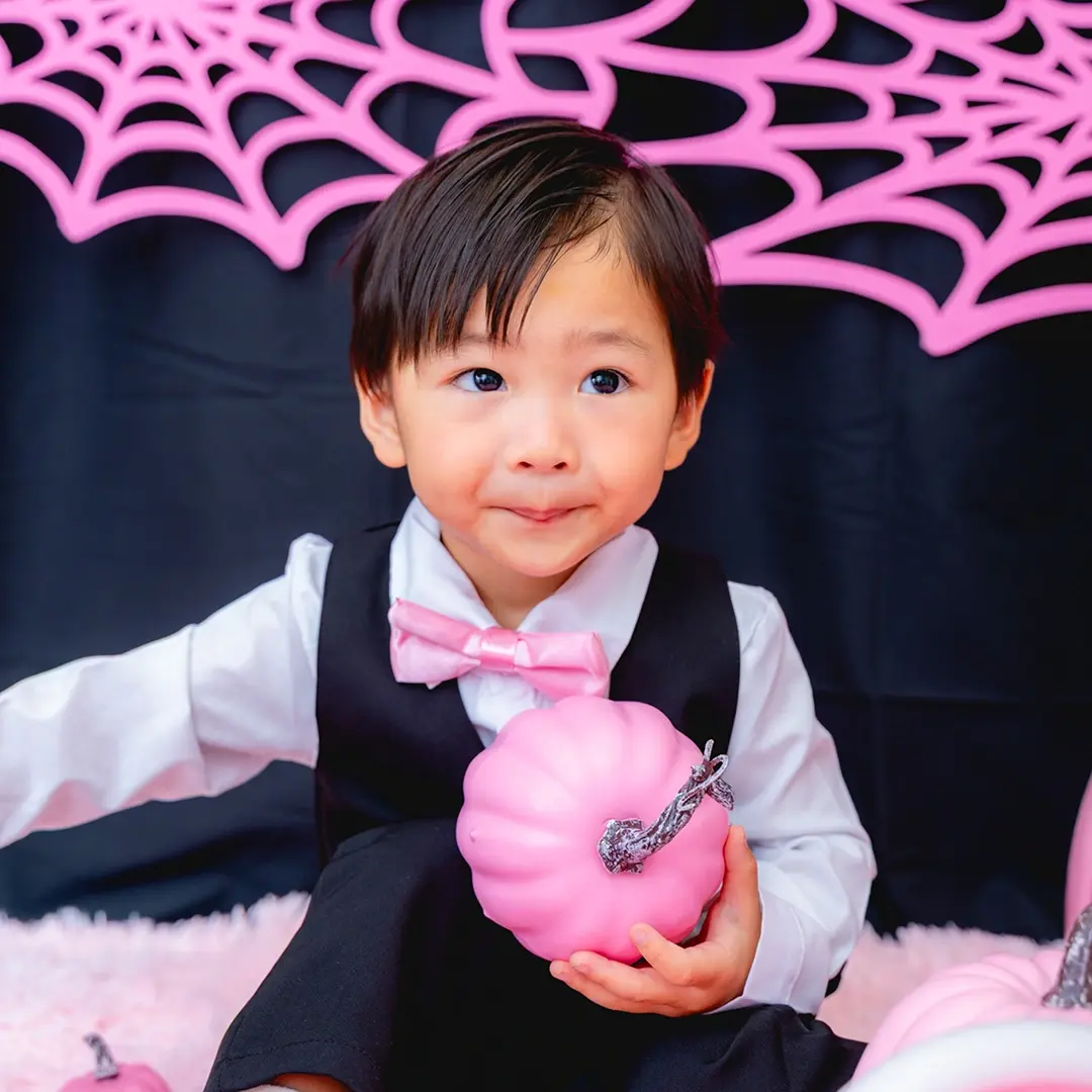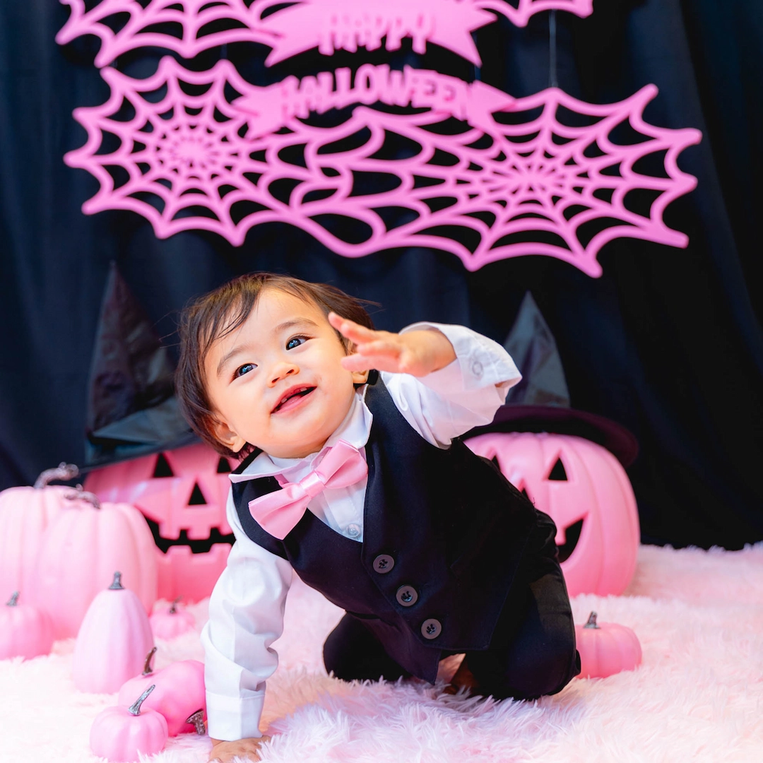 男の子にはピンクの蝶ネクタイが映えるクールなブラックフォーマルをご用意。