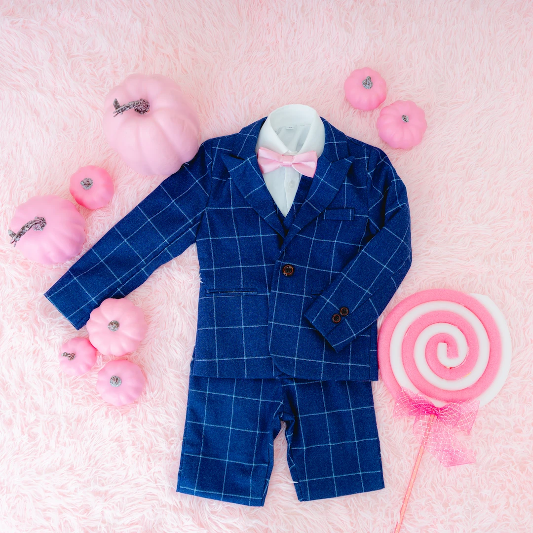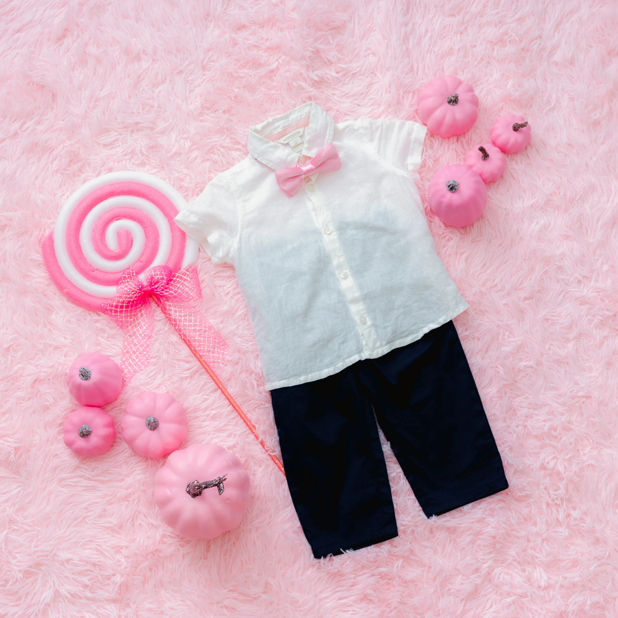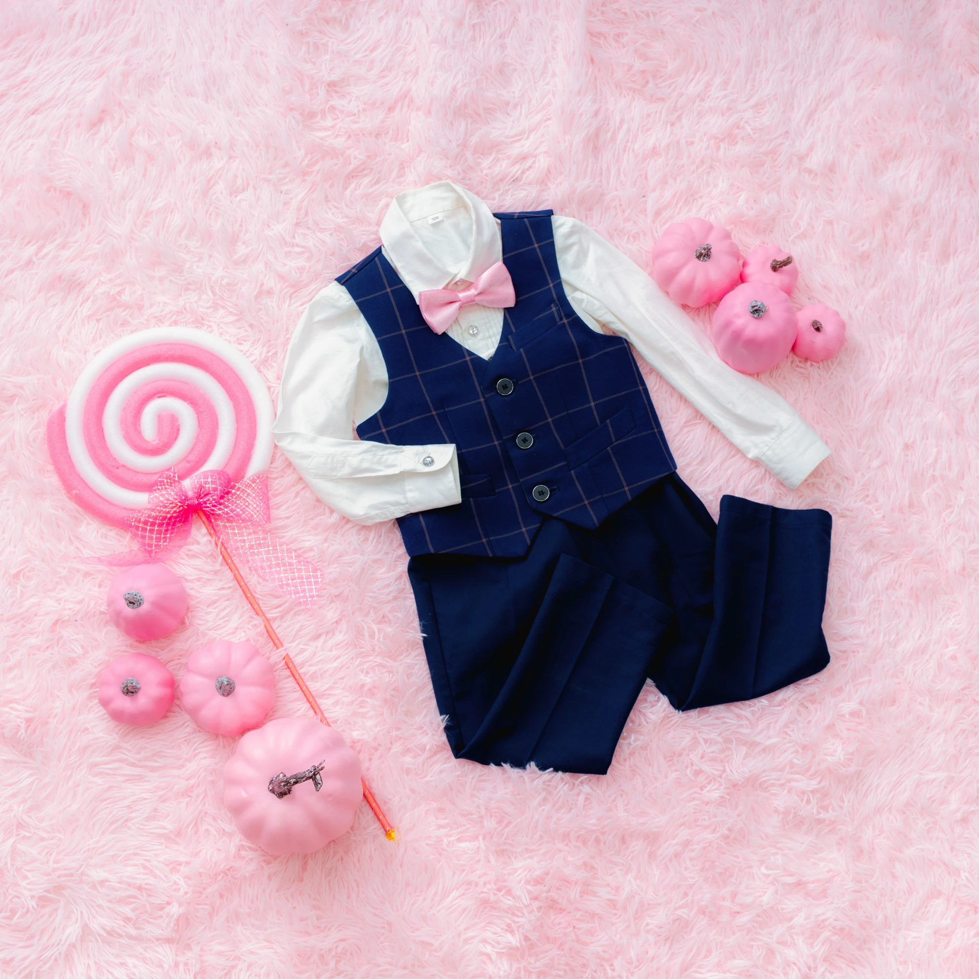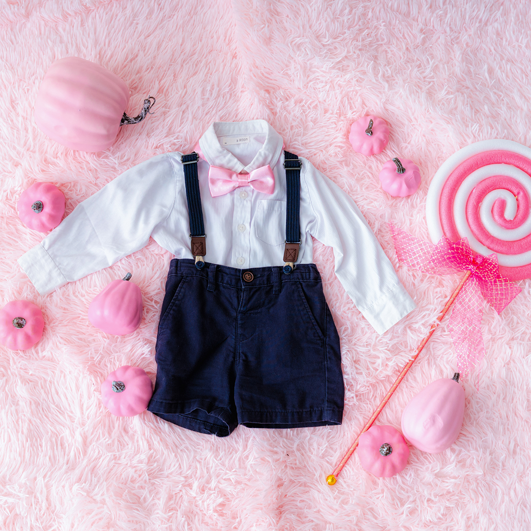 男の子にはピンクの蝶ネクタイが映えるクールなブラックフォーマルをご用意。