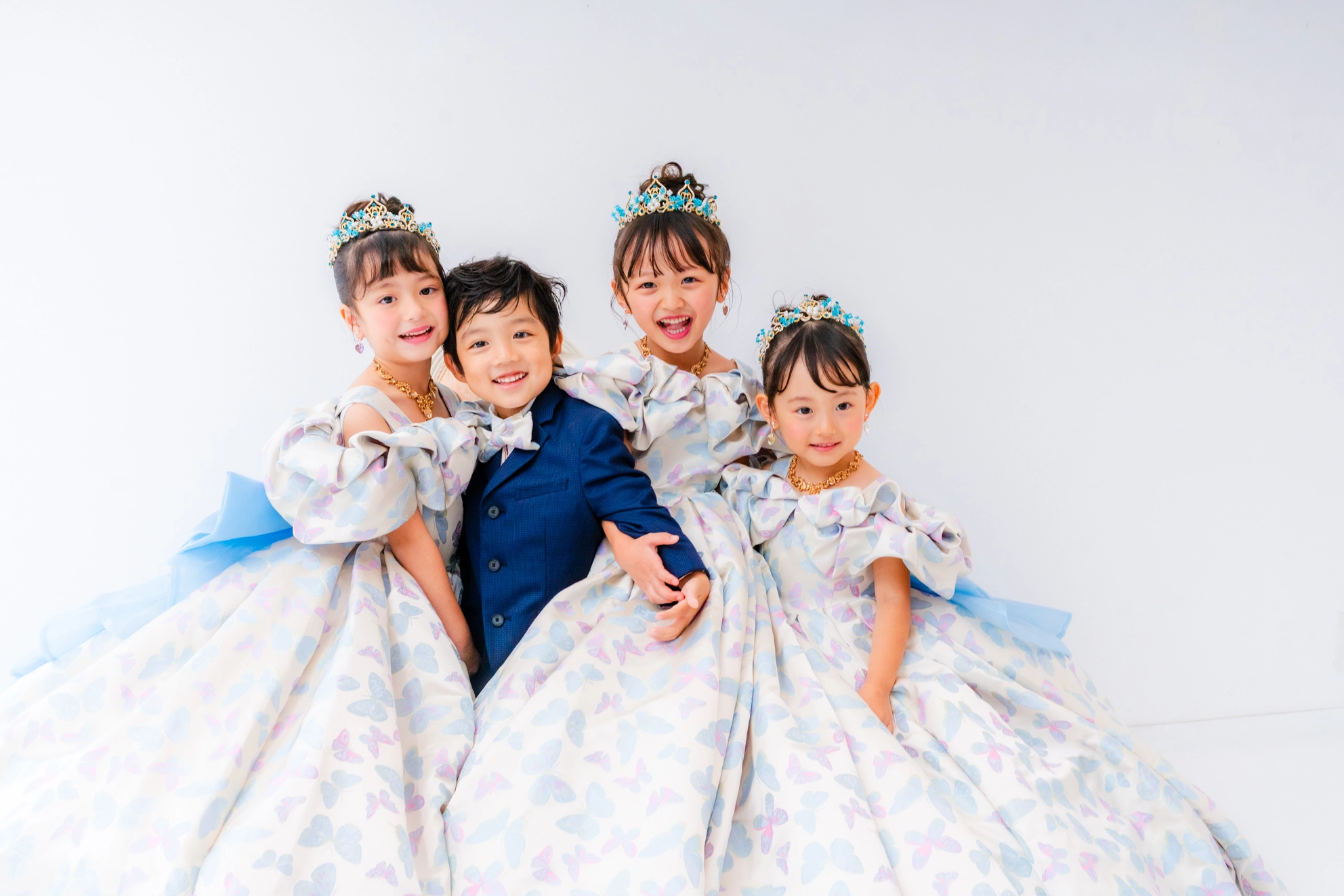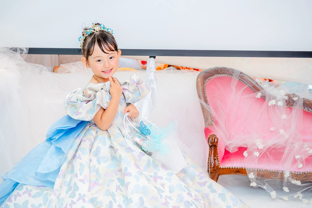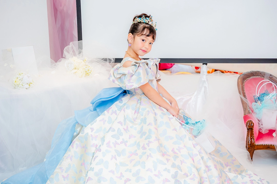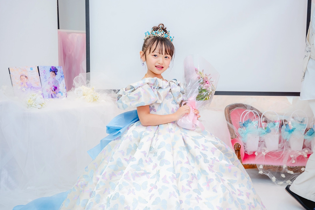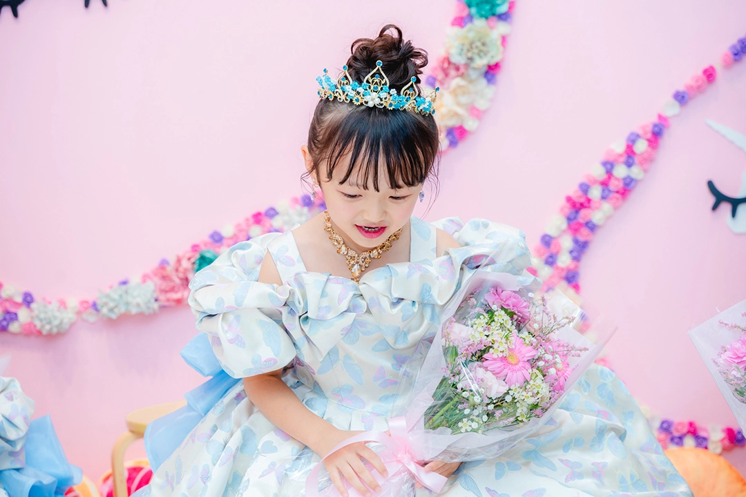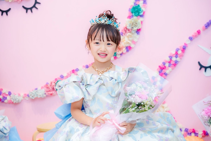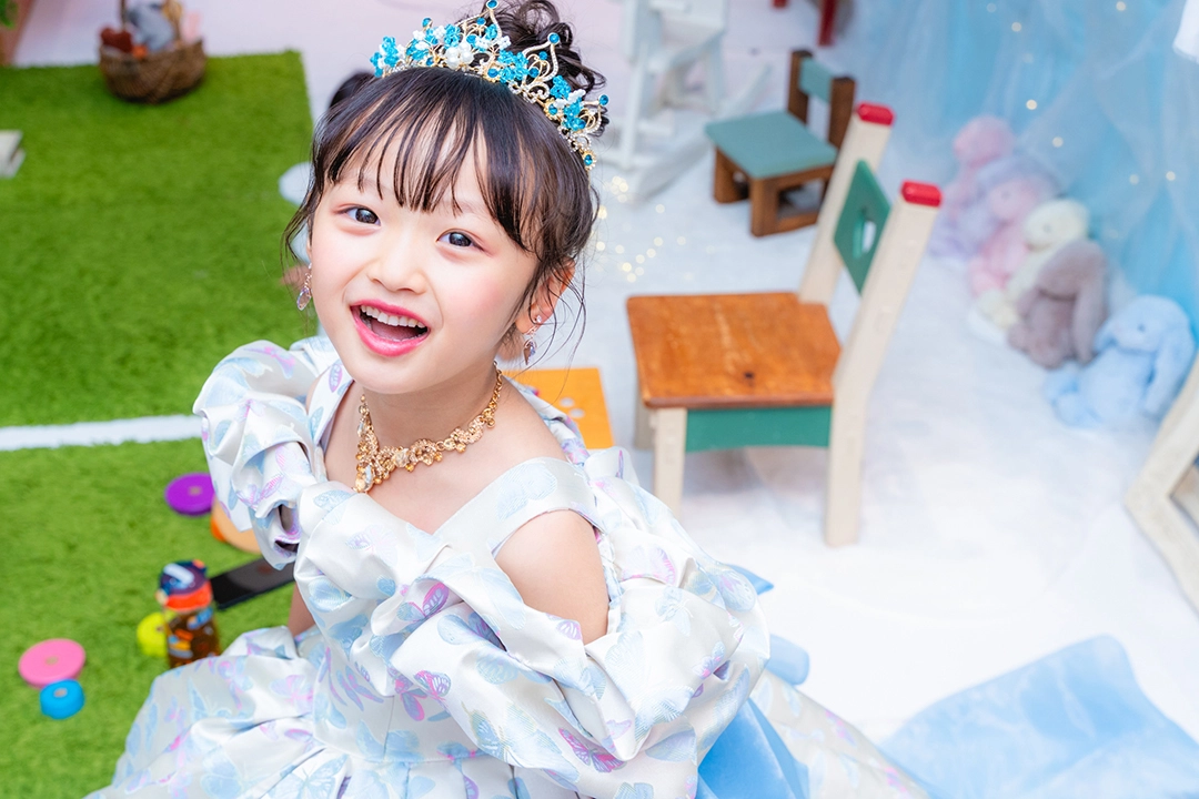 ティアラやアクセサリーにターコイズブルーでアクセントを加え、