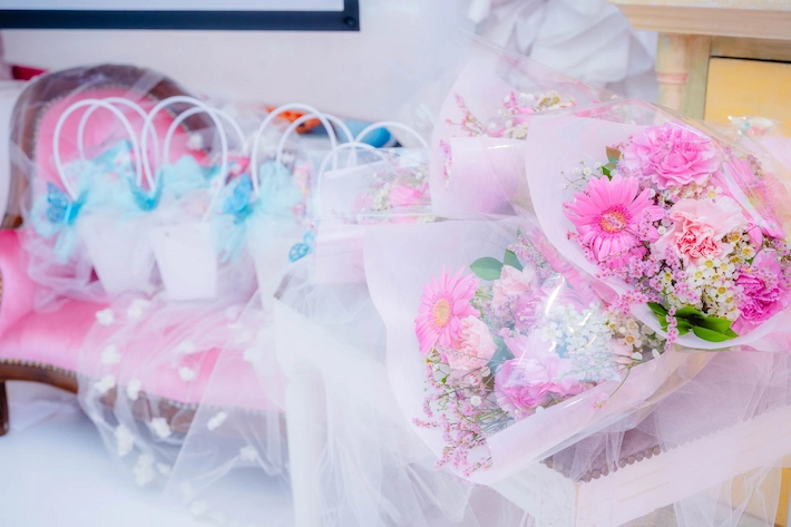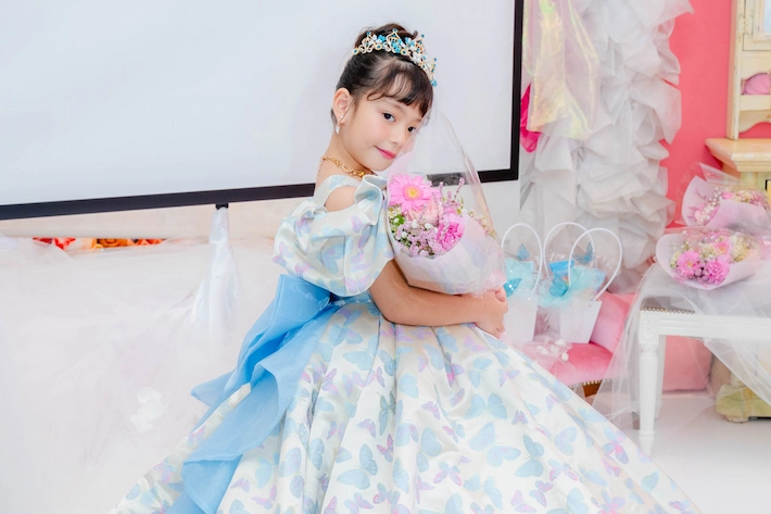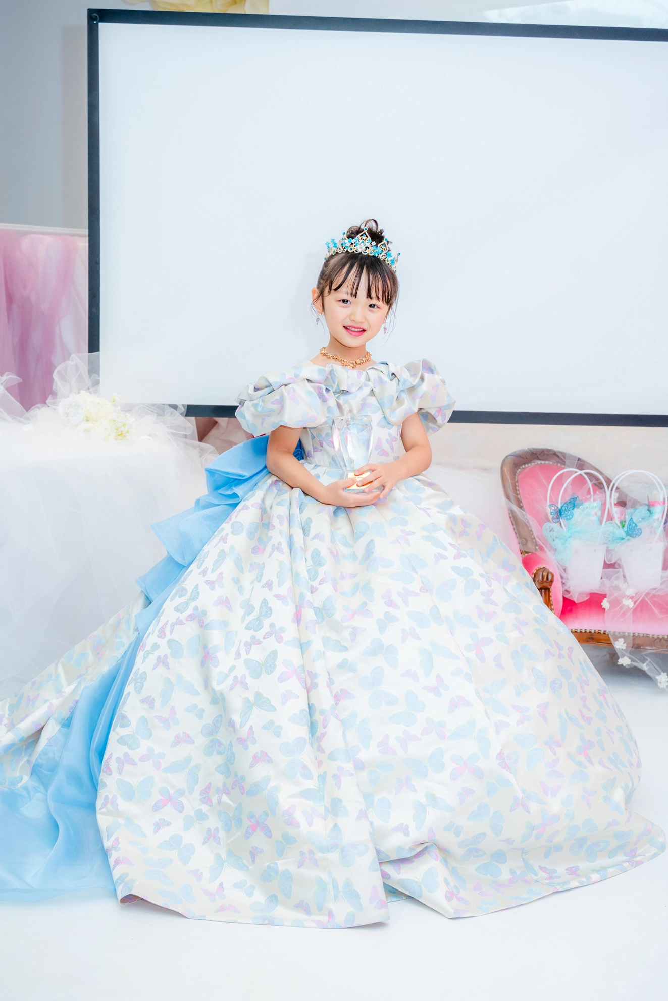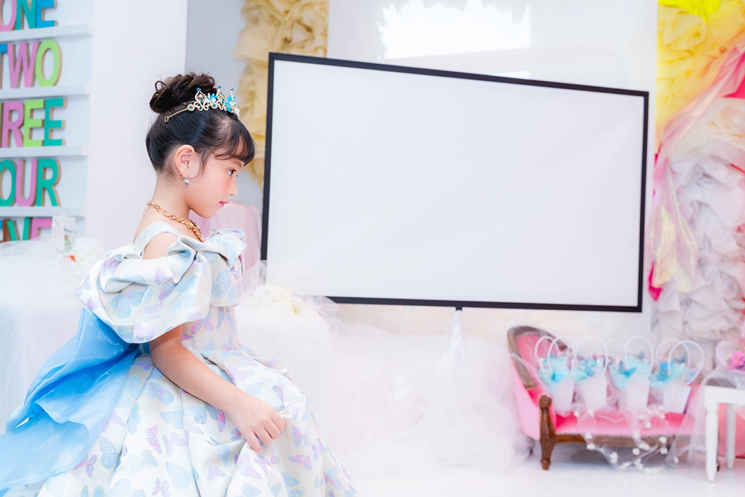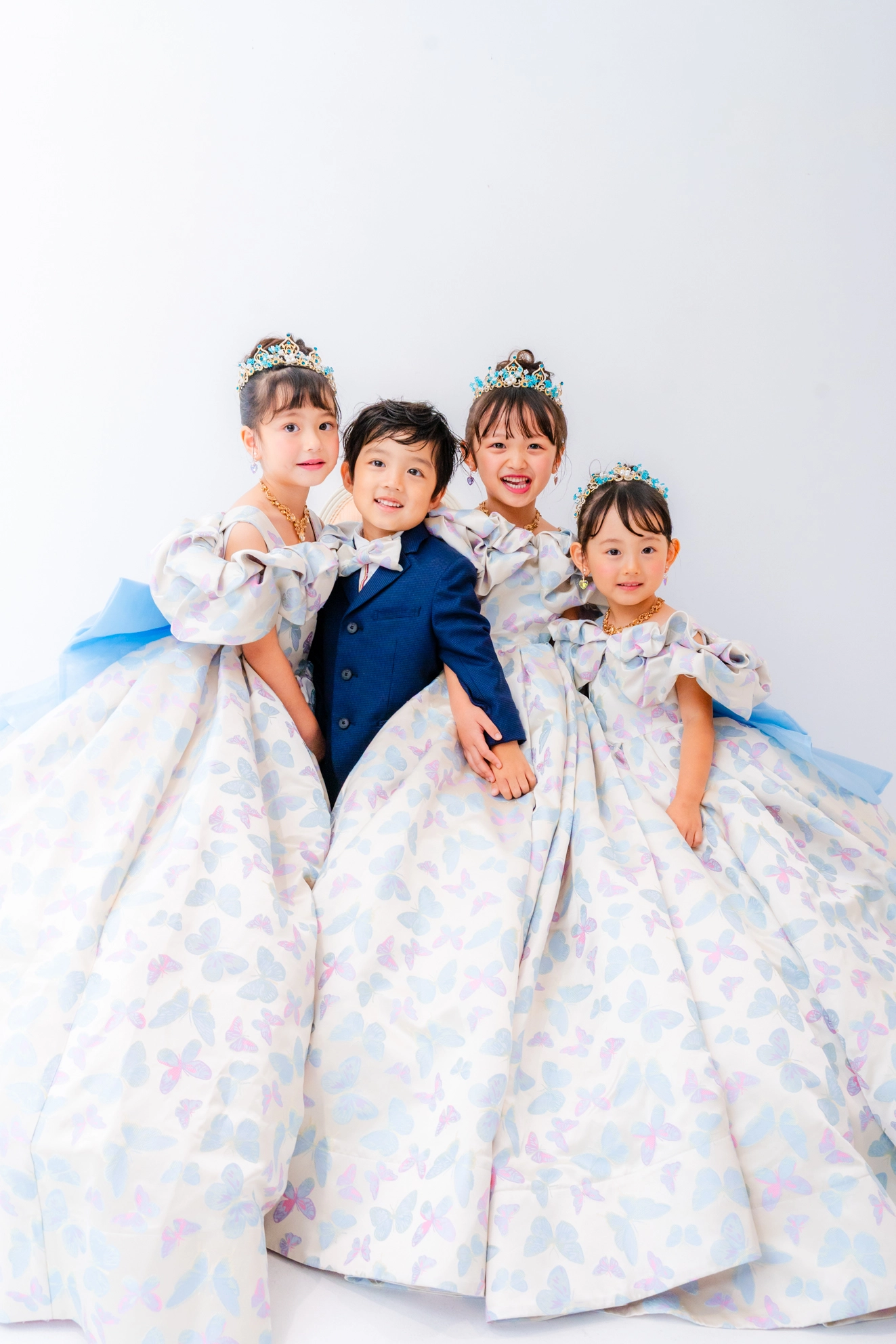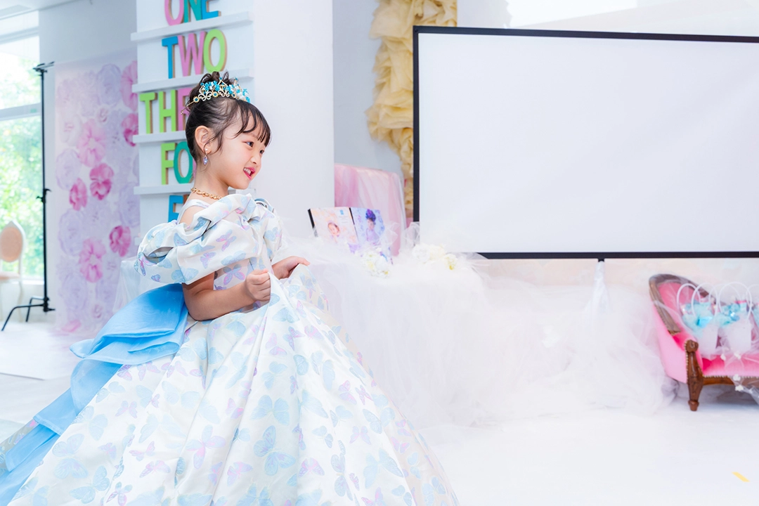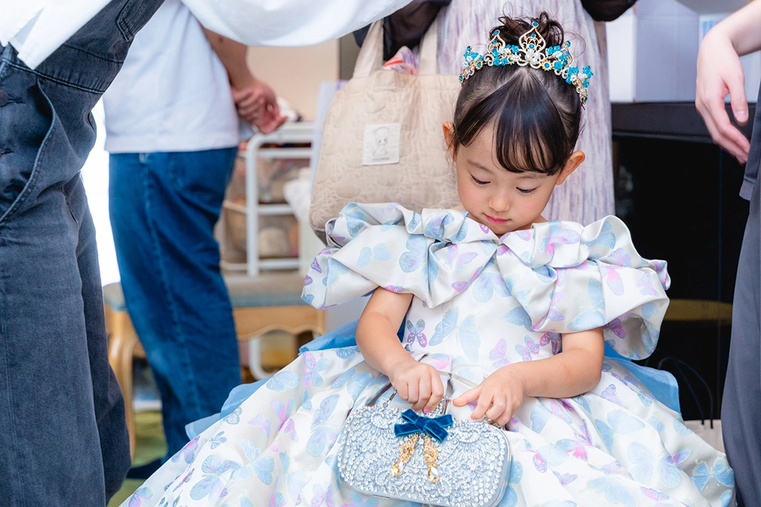 ティアラやアクセサリーにターコイズブルーでアクセントを加え、