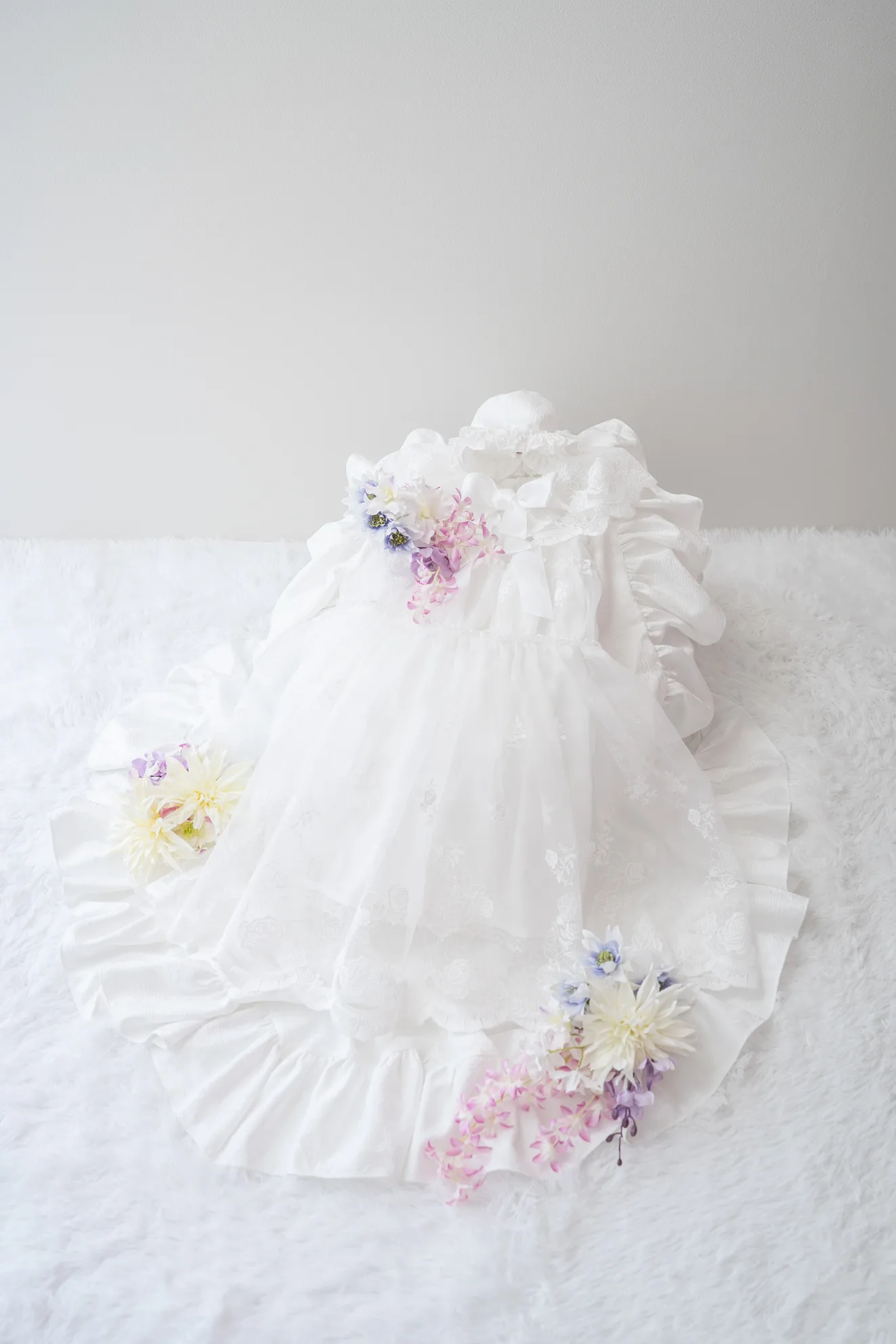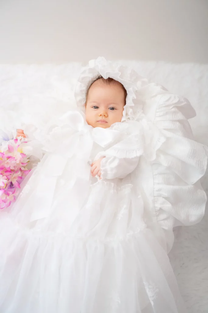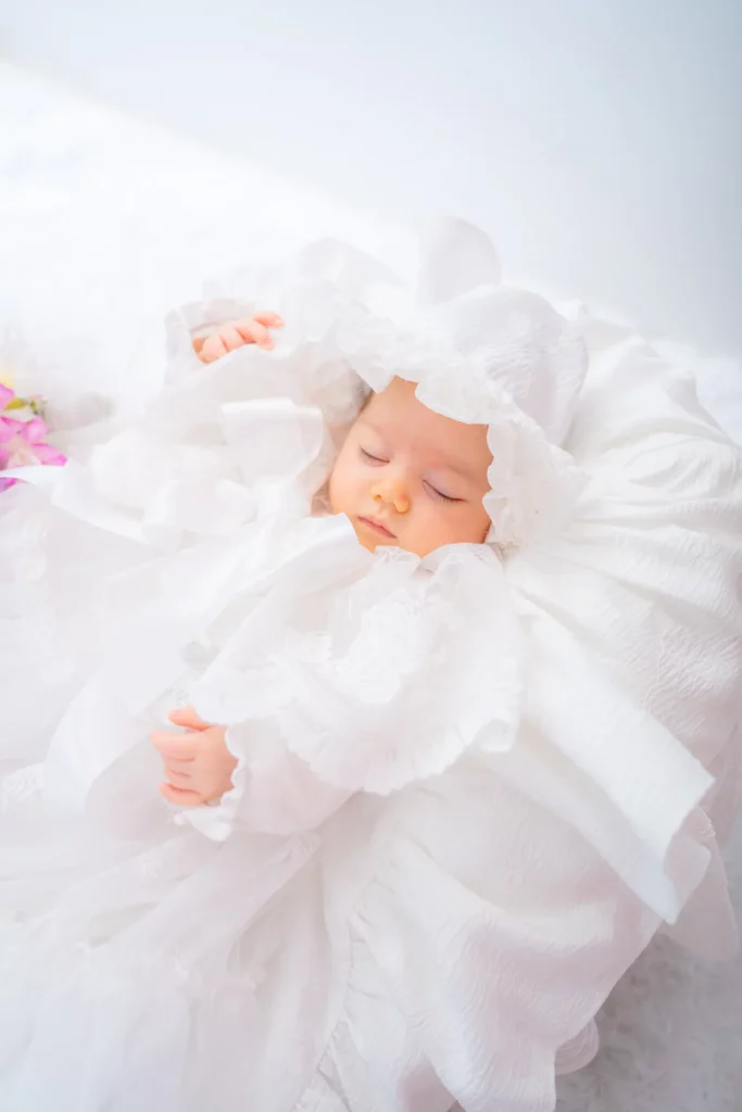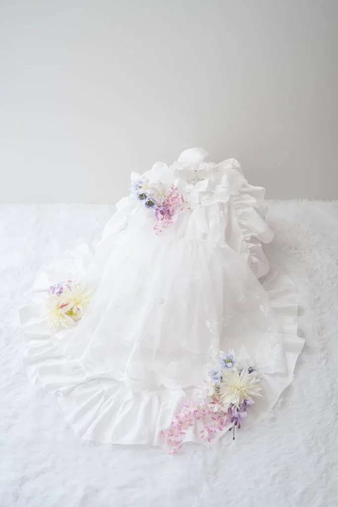やわらかな素材感とフリルのやさしい表情が、赤ちゃんを包み込むような安心感を演出します。