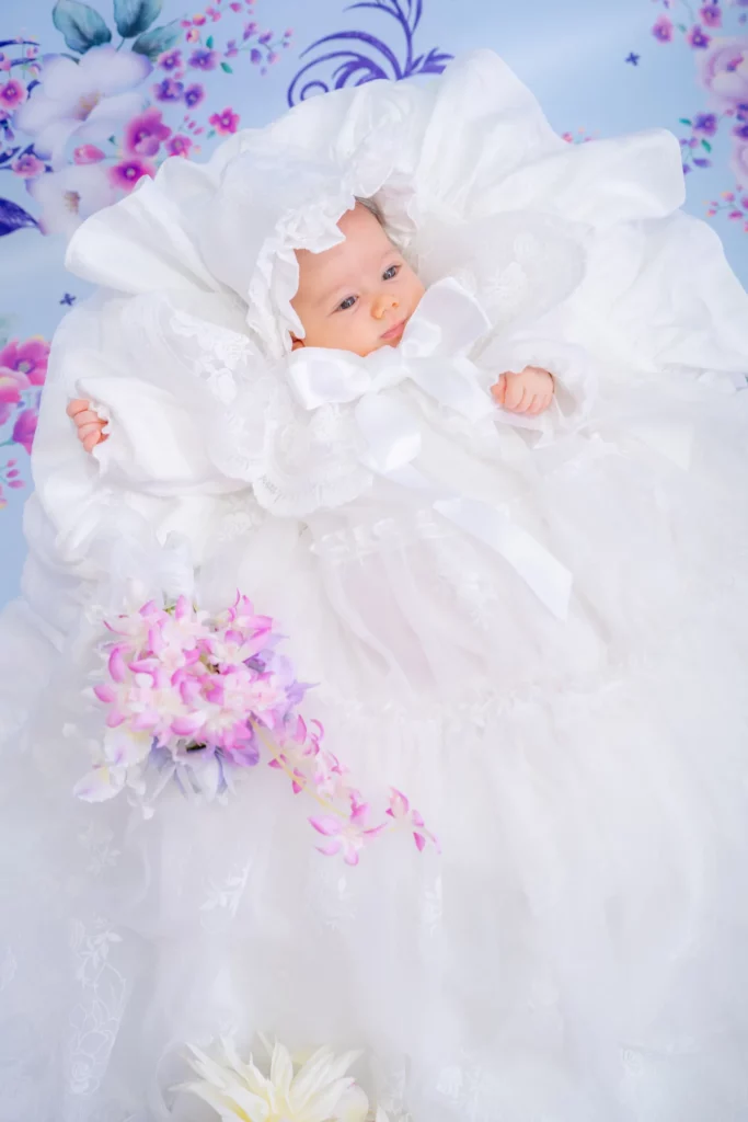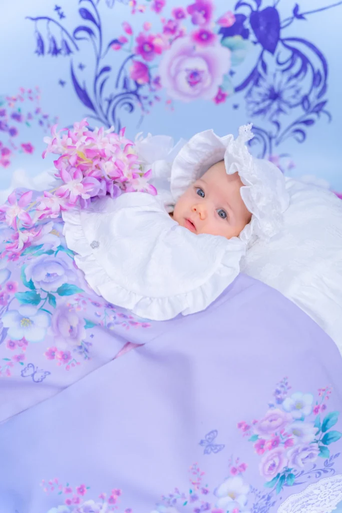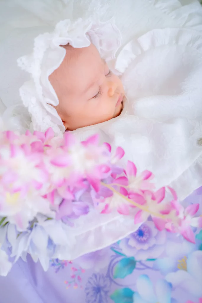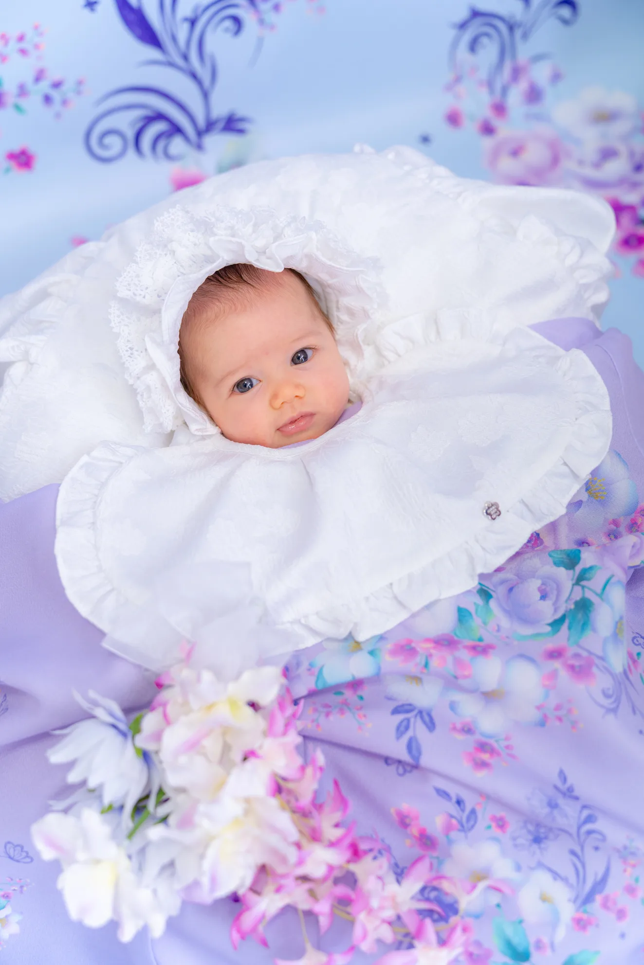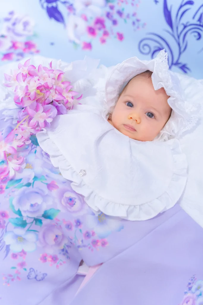 やわらかな素材感とフリルのやさしい表情が、赤ちゃんを包み込むような安心感を演出します。