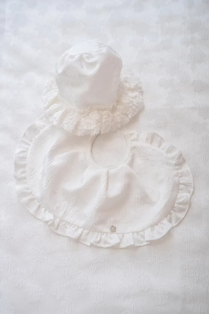 帽子・スタイ・かごカバーを同素材で揃え、上品で統一感のあるコーディネートに仕上げました。
