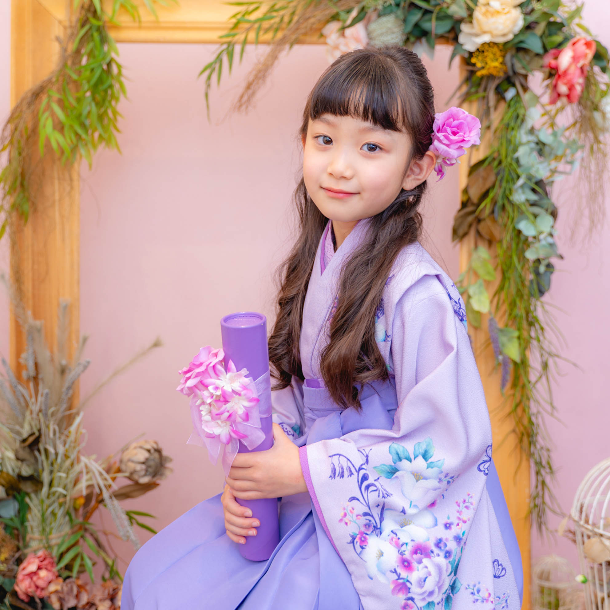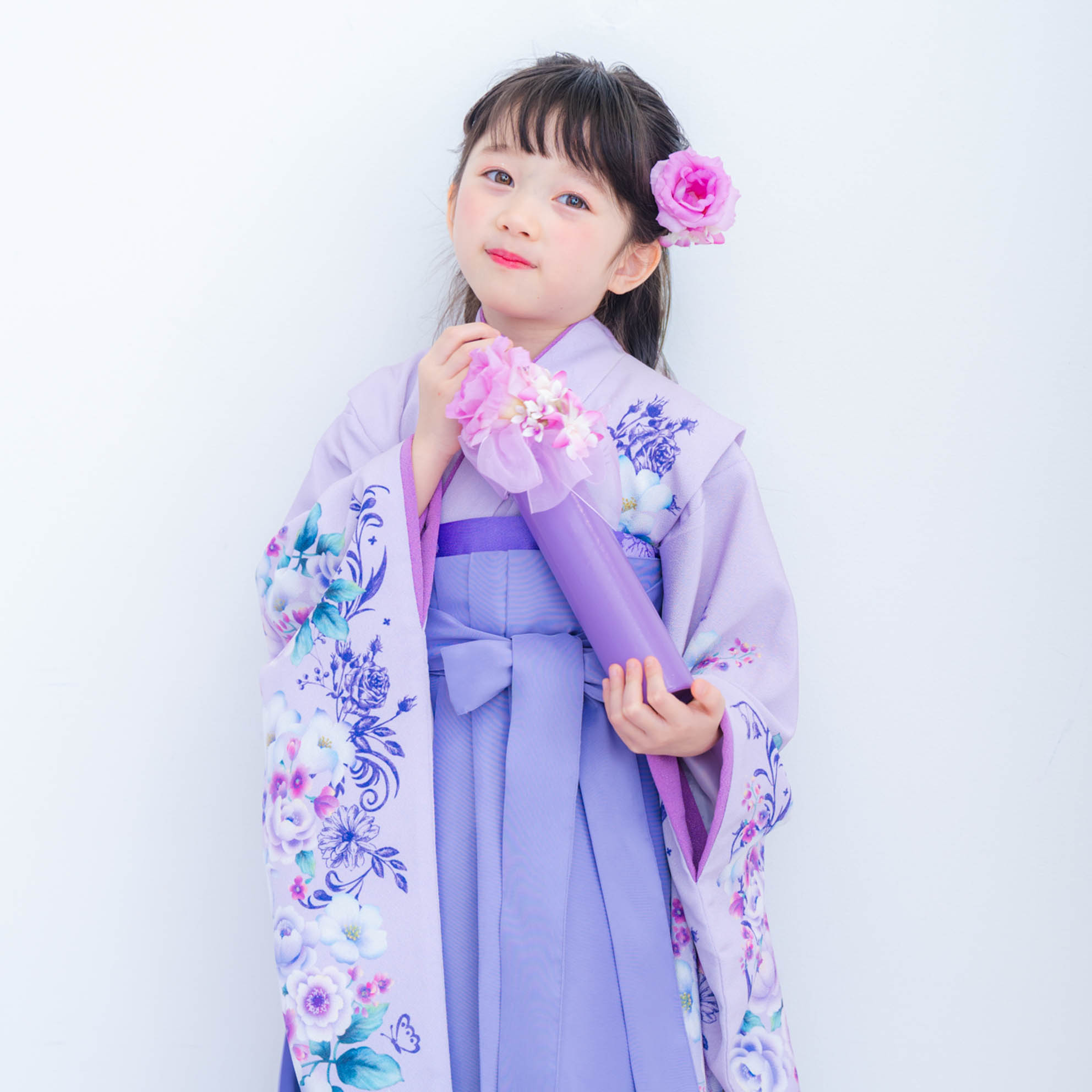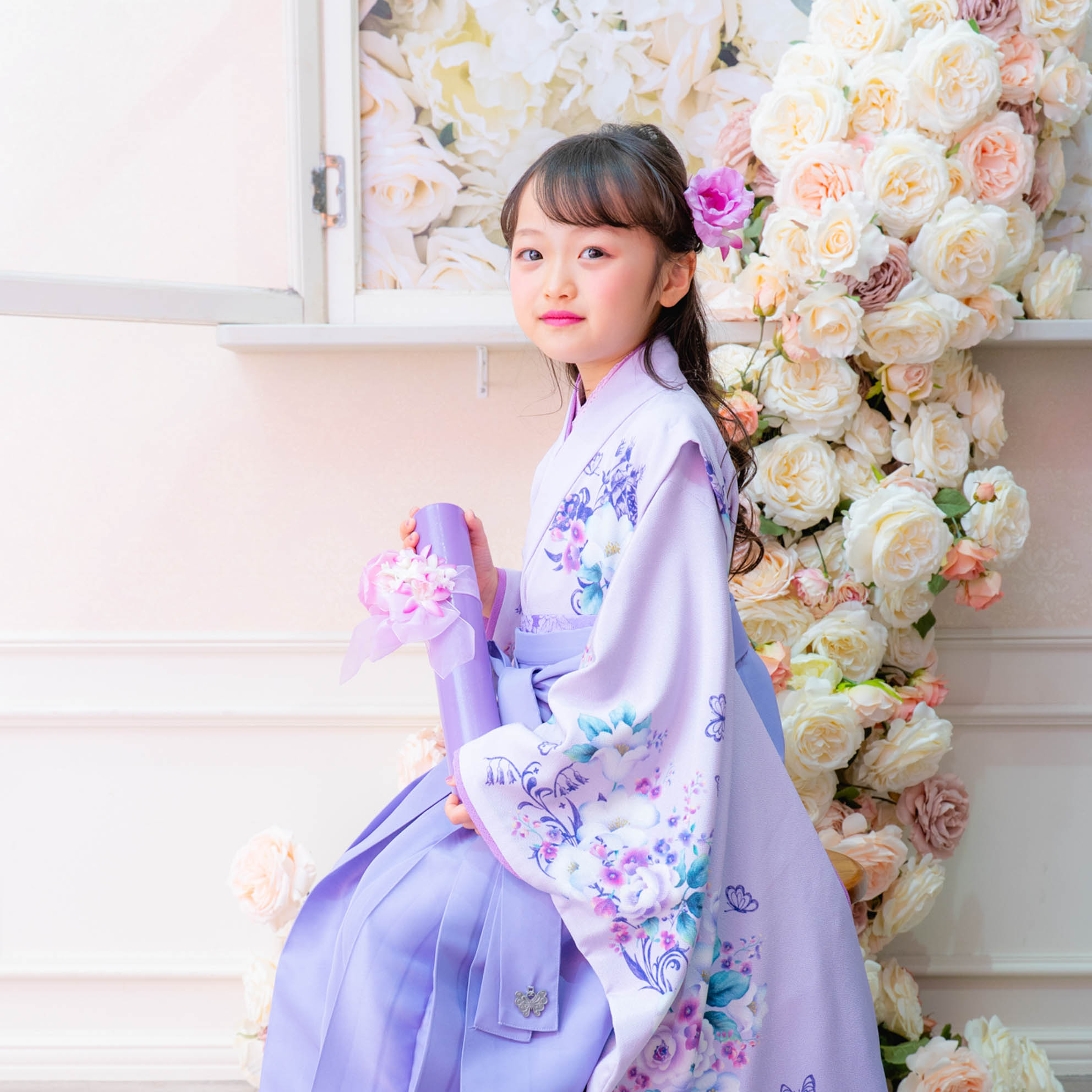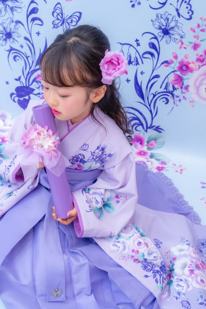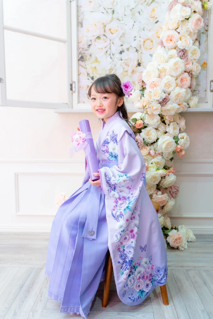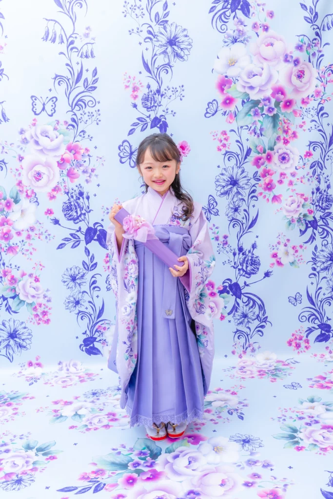 やさしいラベンダーカラーが印象的な袴の装いは、