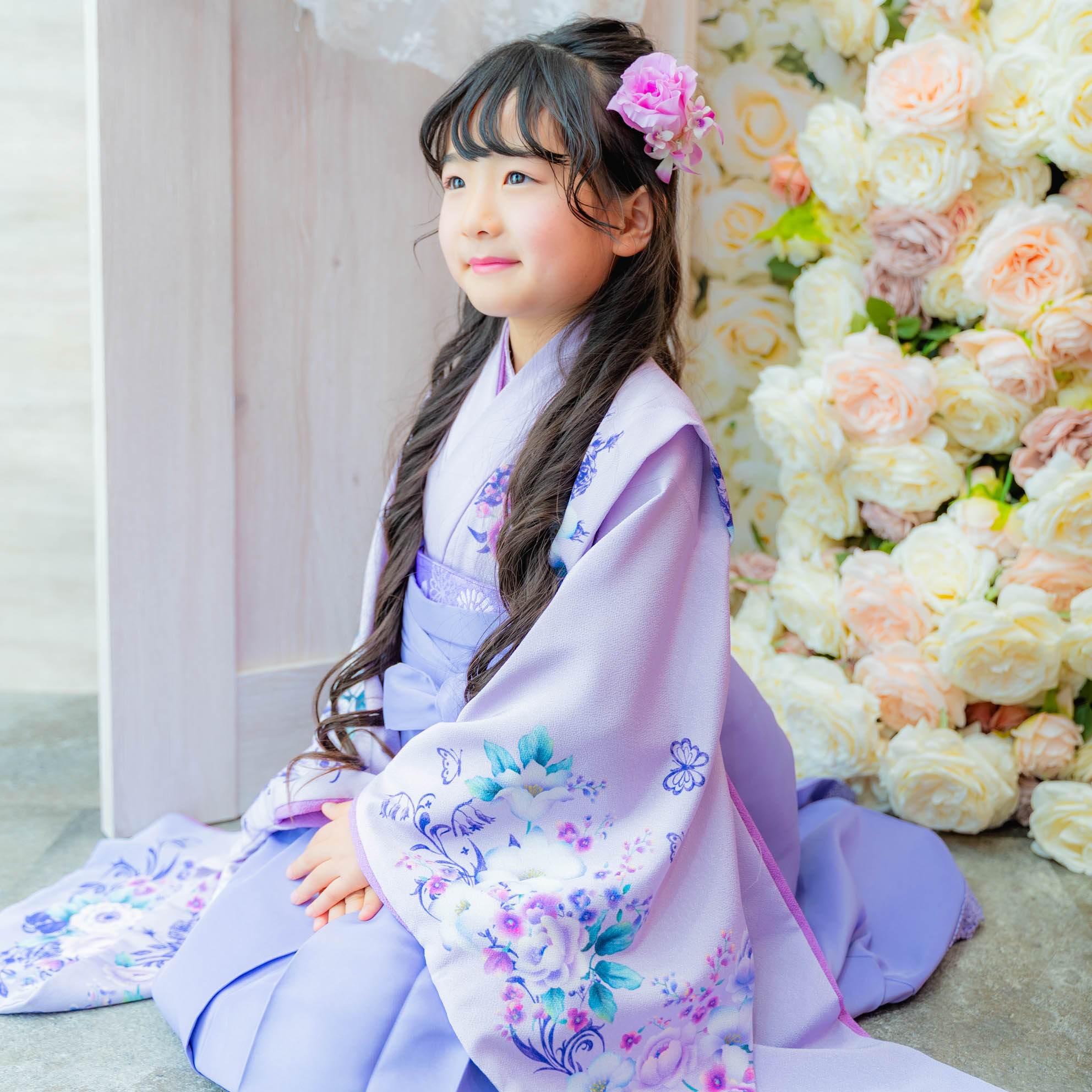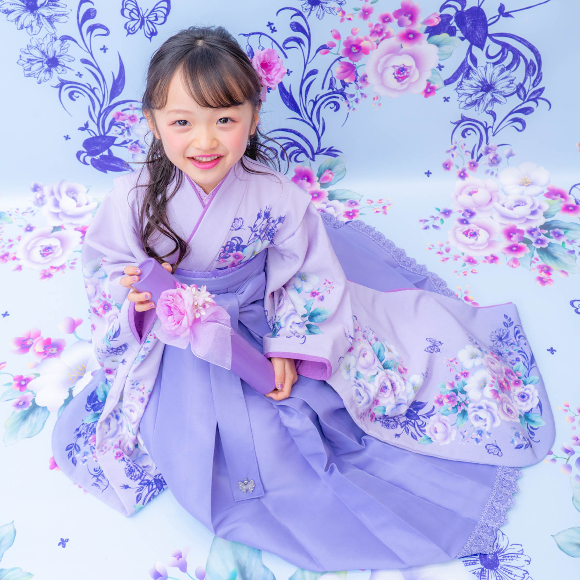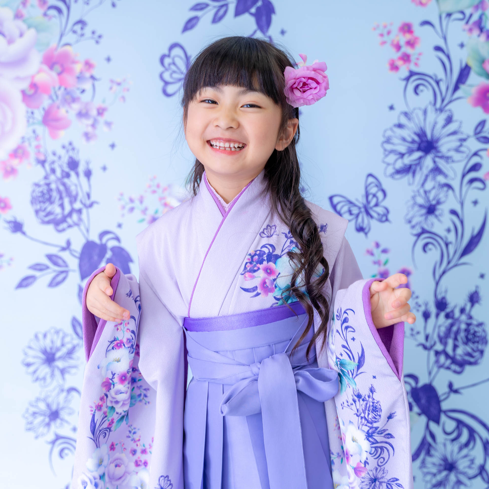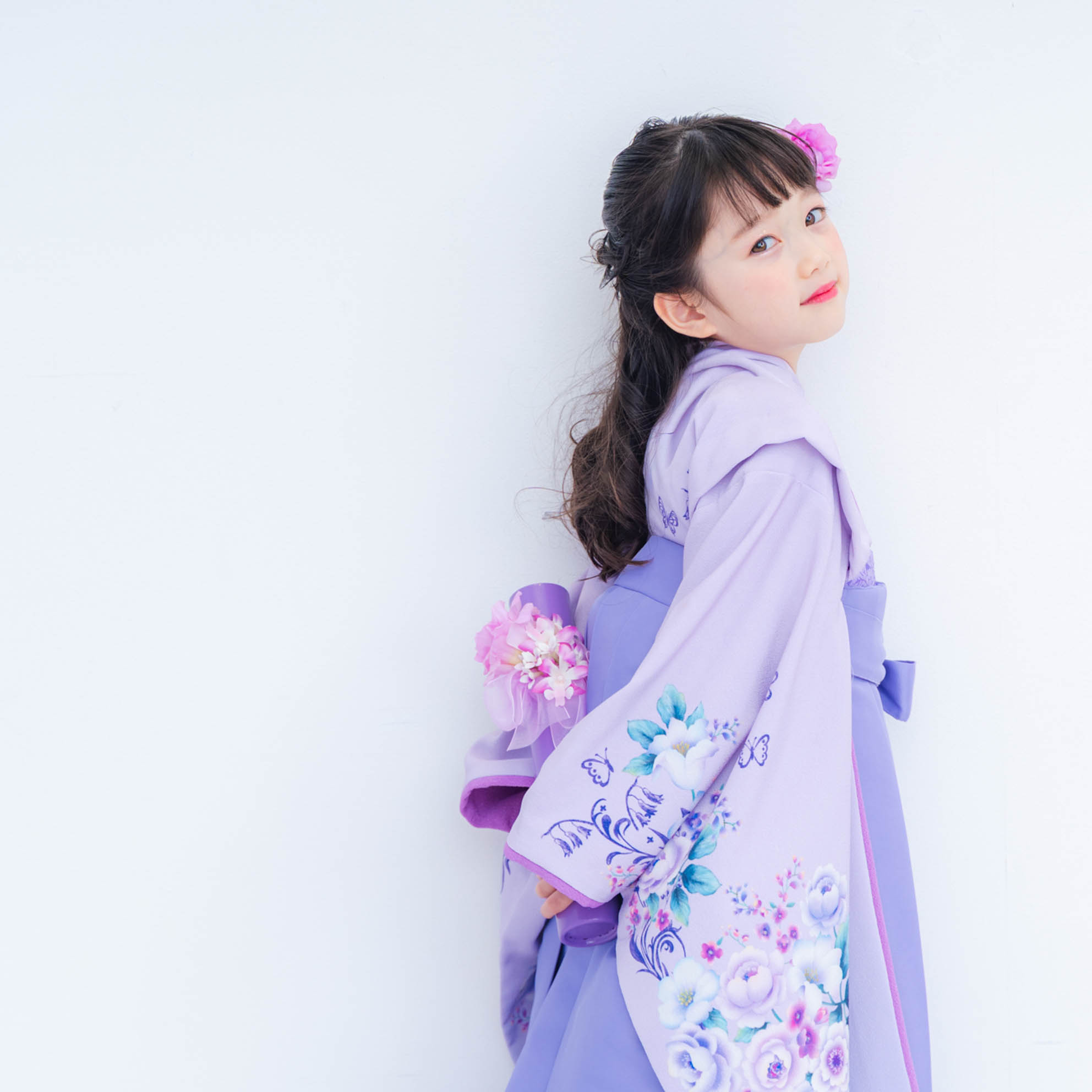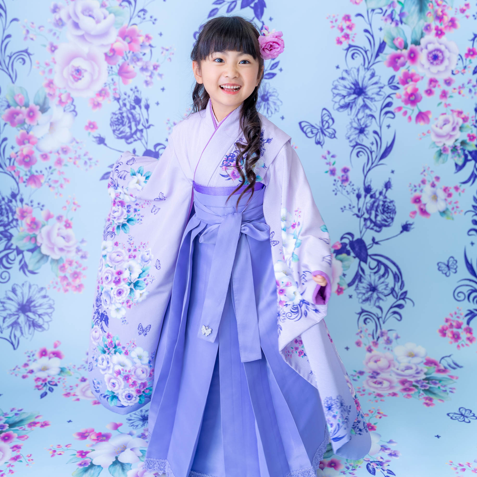 やさしいラベンダーカラーが印象的な袴の装いは、