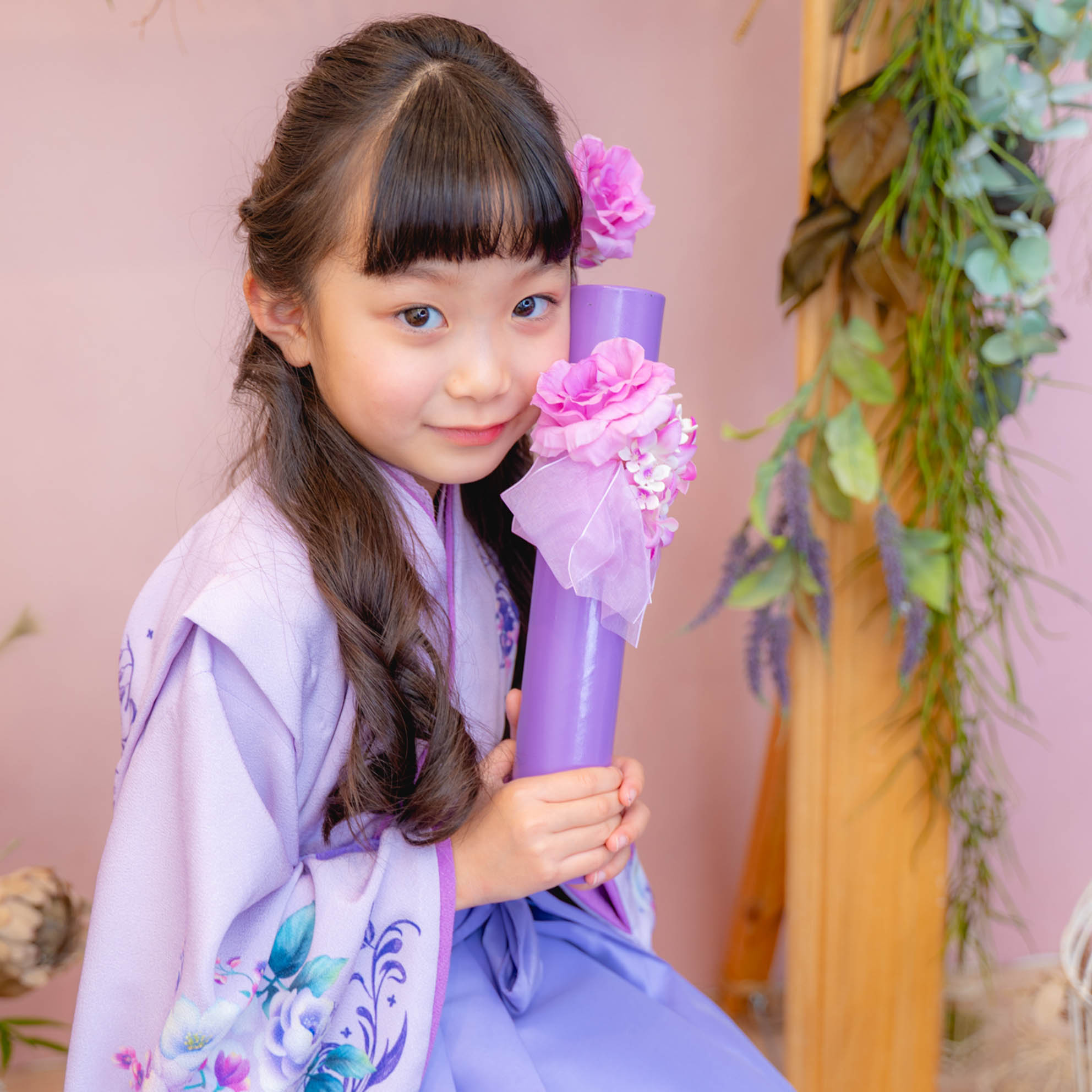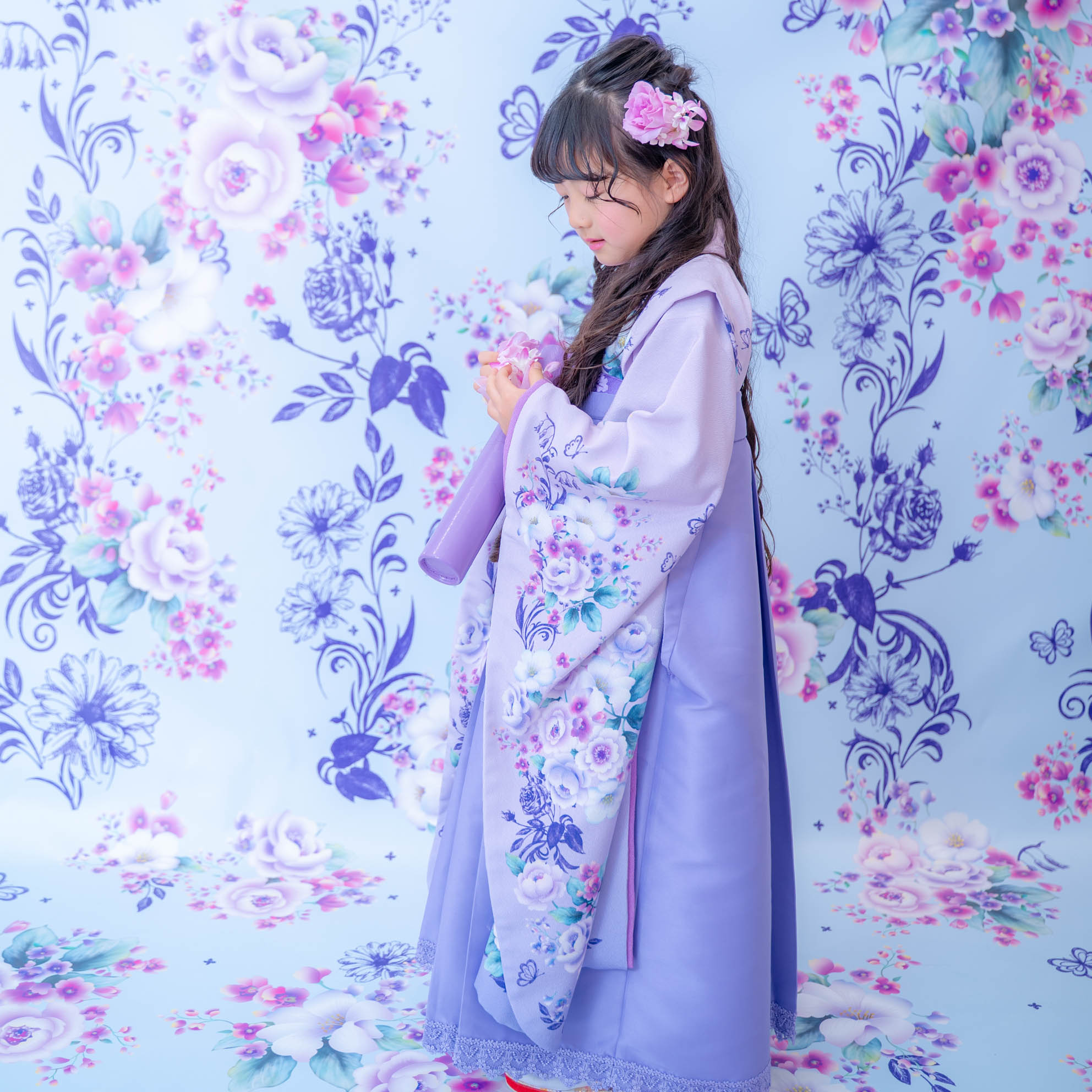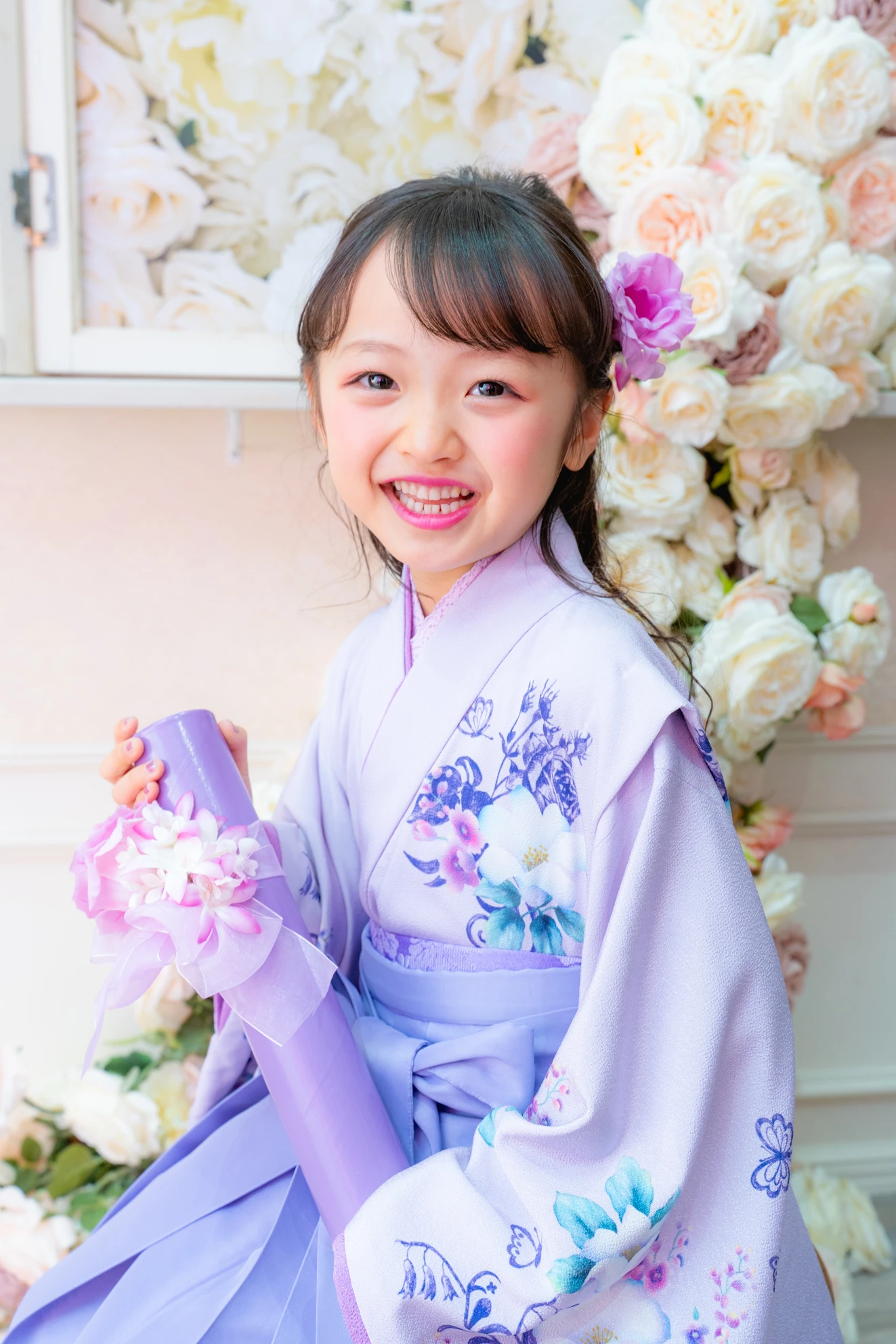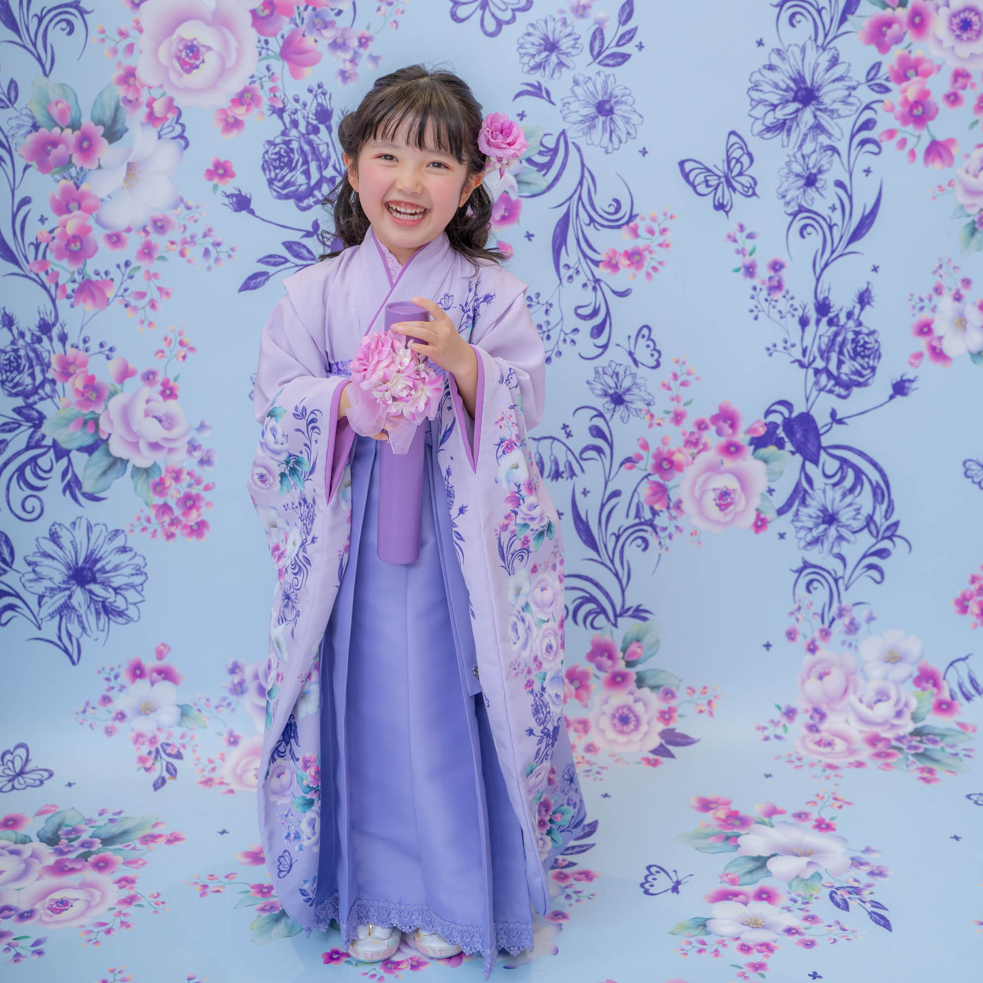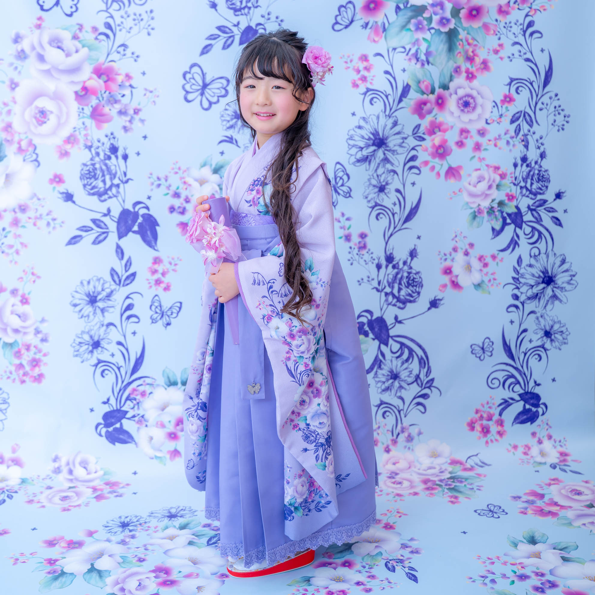 やさしいラベンダーカラーが印象的な袴の装いは、