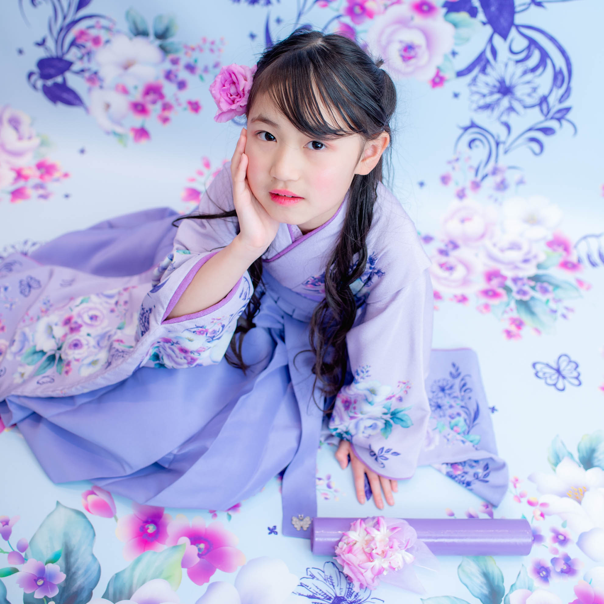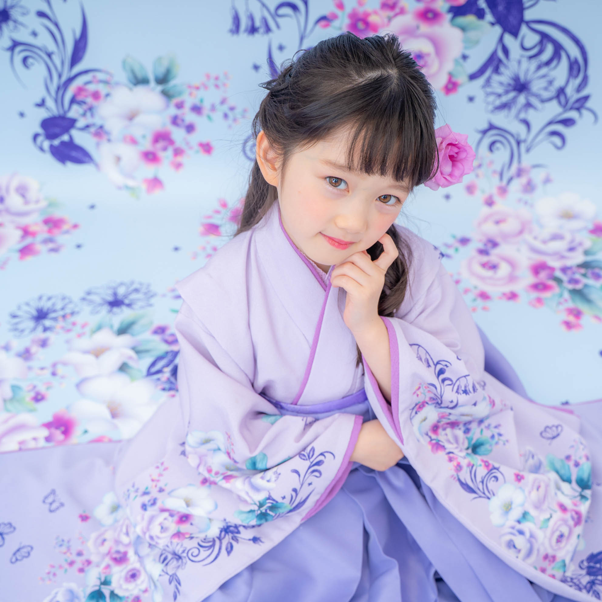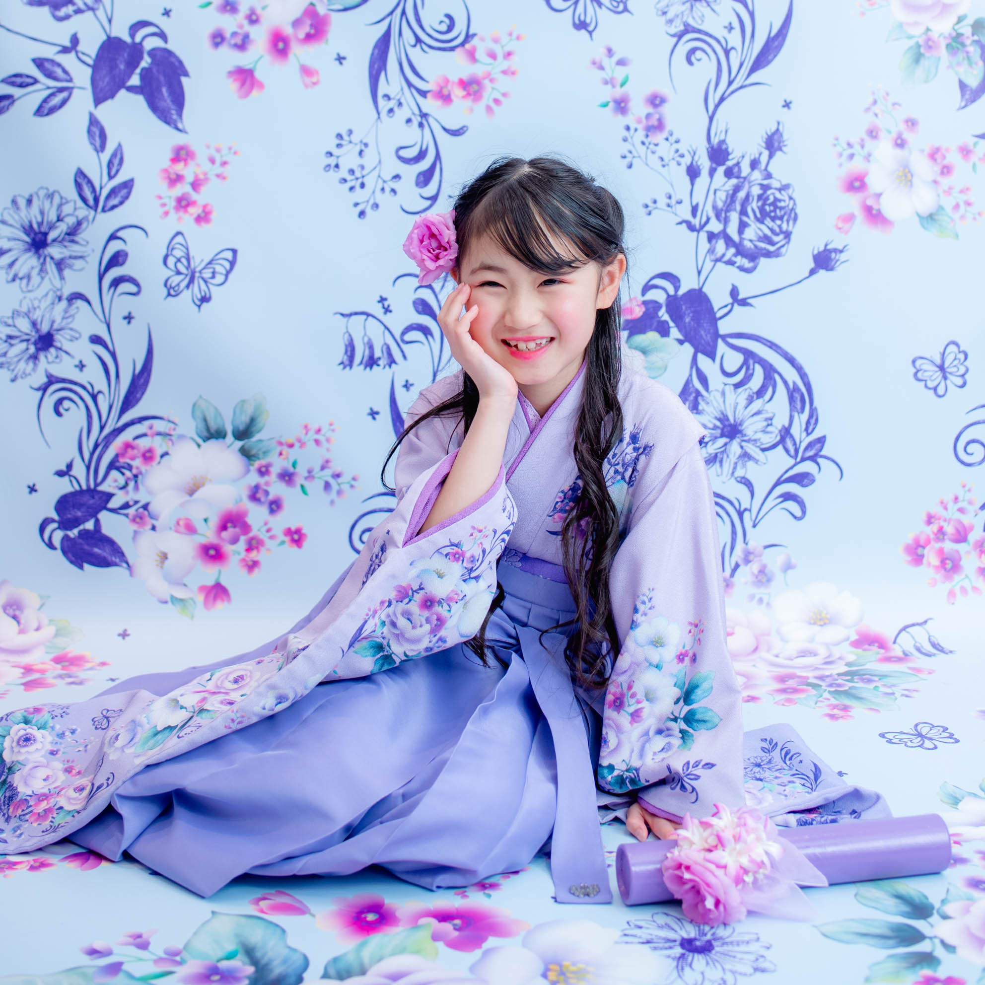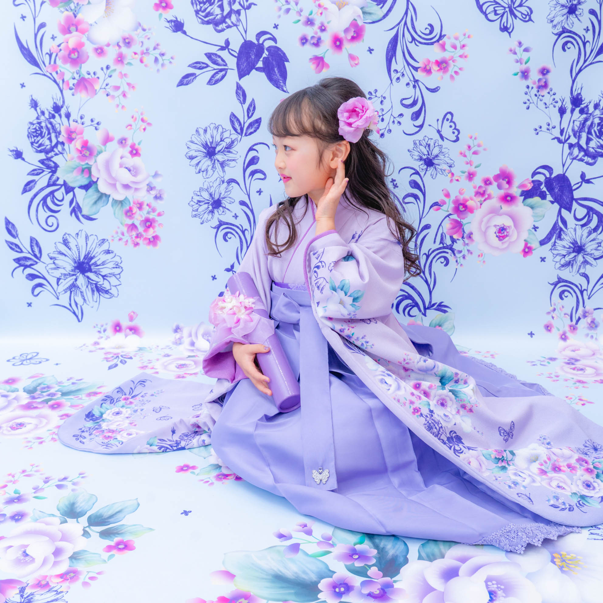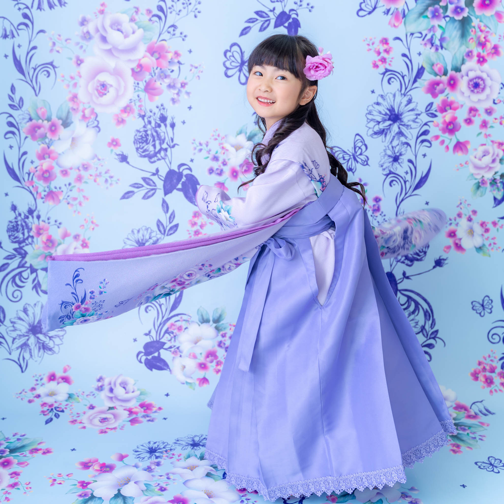 やさしいラベンダーカラーが印象的な袴の装いは、