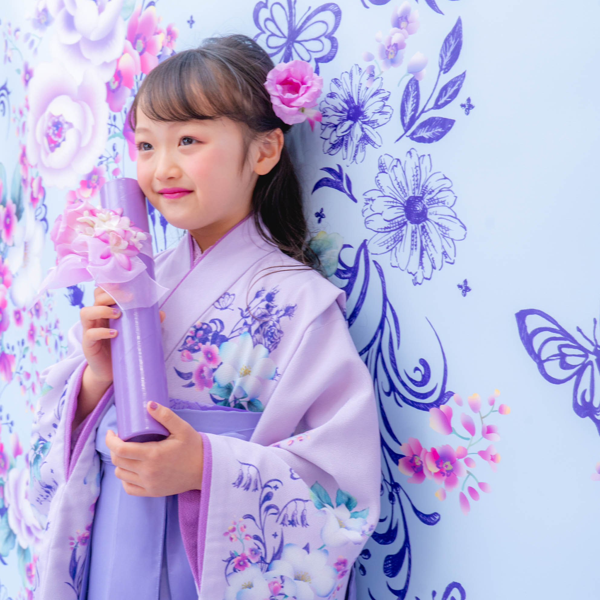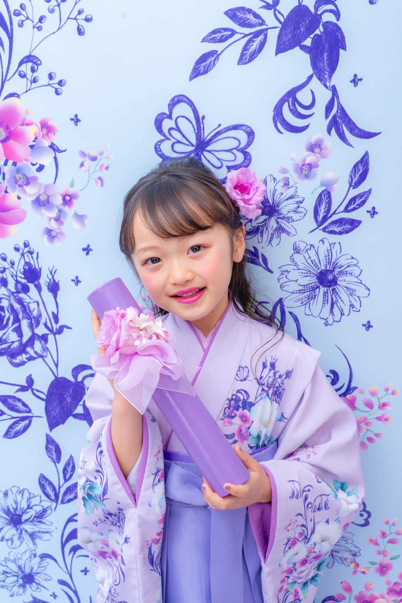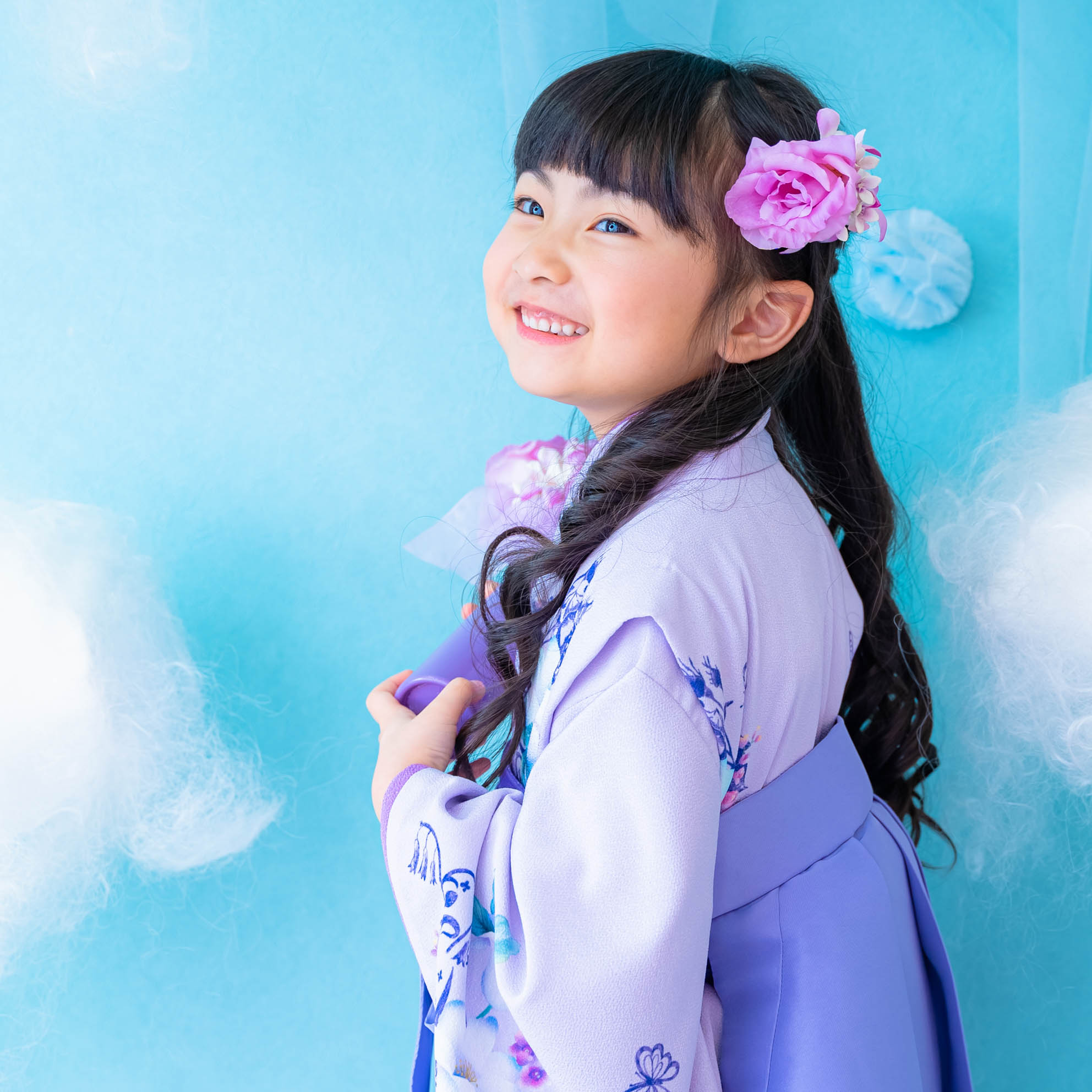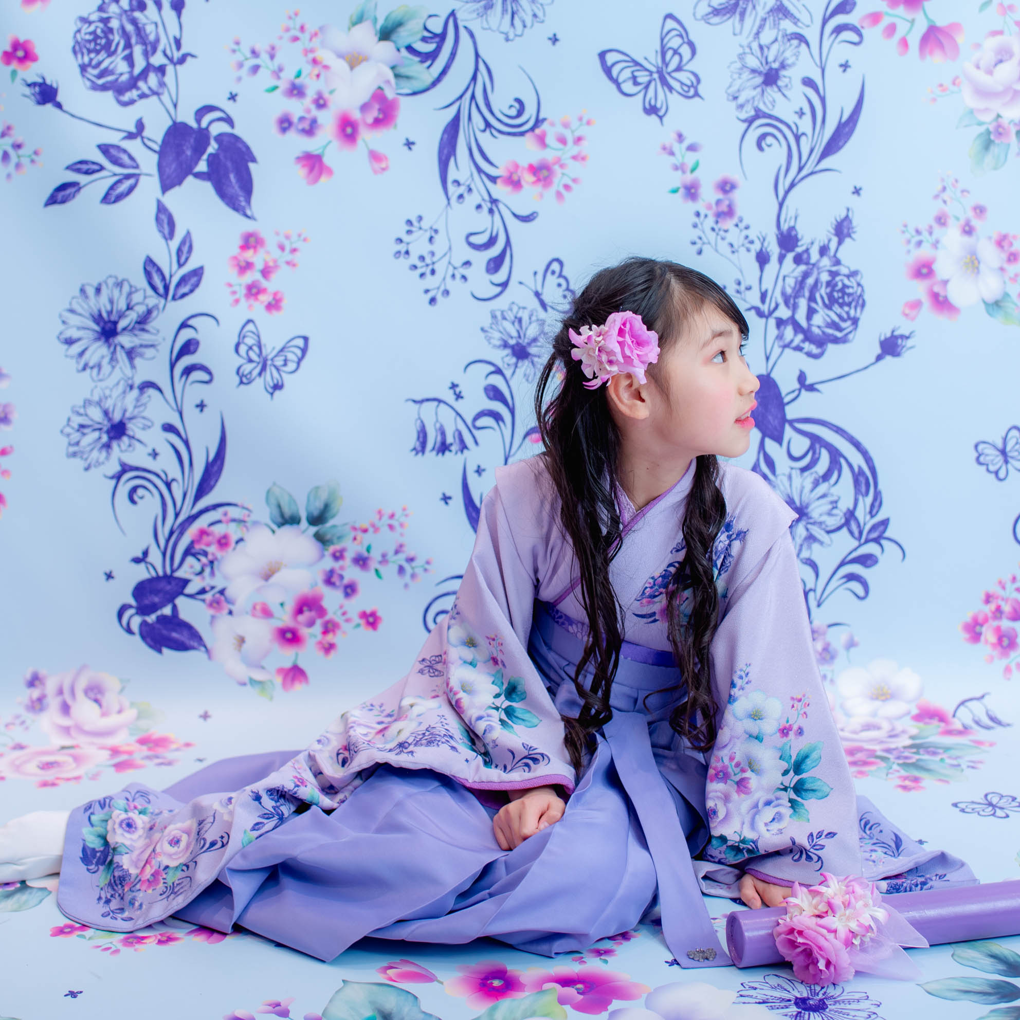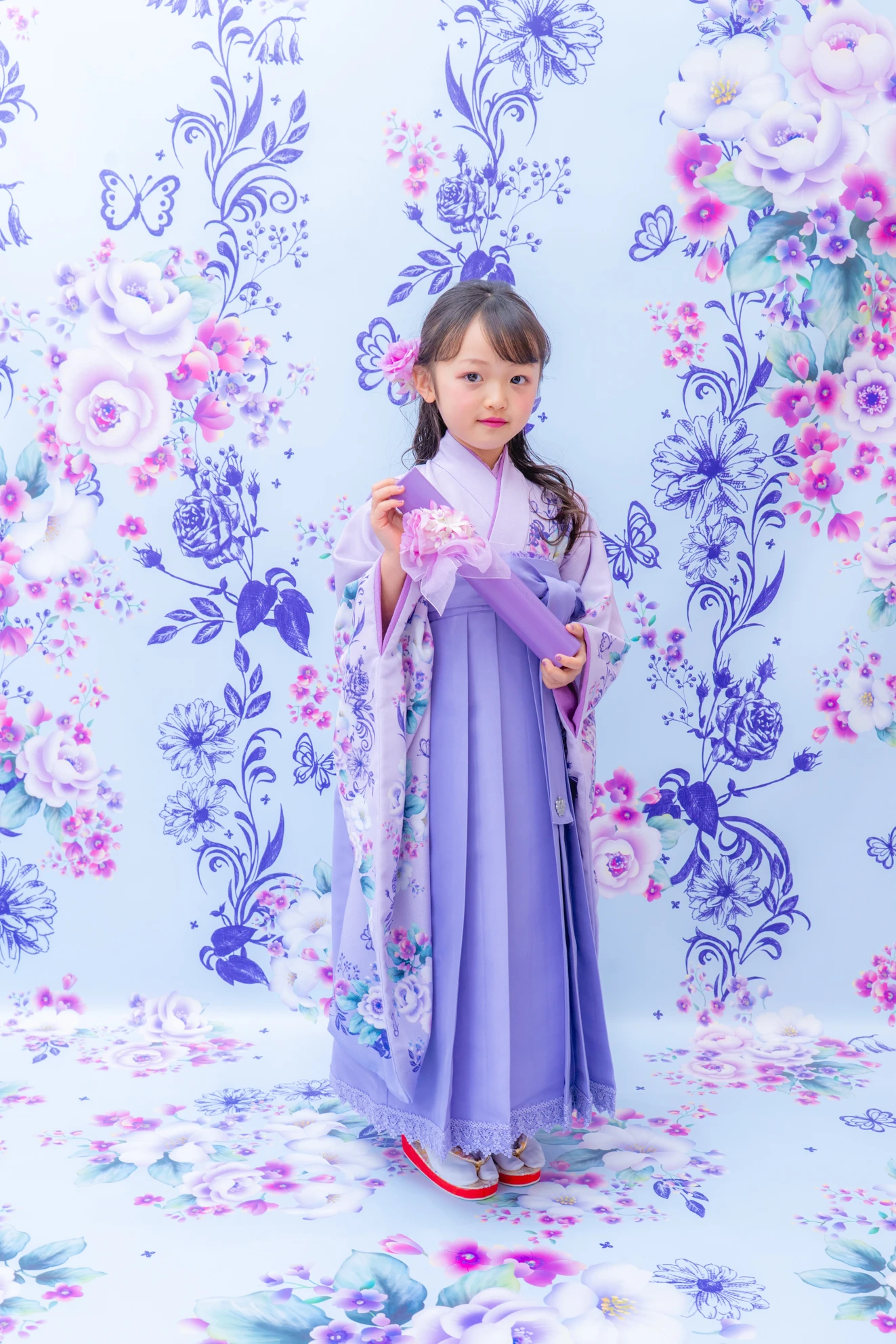 やさしいラベンダーカラーが印象的な袴の装いは、
