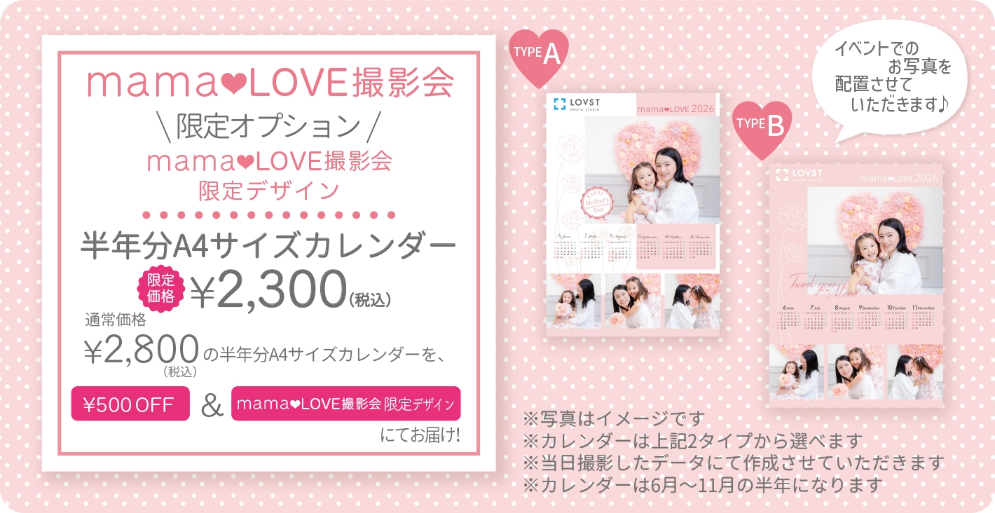 ※通常¥2,800(税込)の半年分A4サイズカレンダーを、¥500 OFF&mama♡LOVE撮影会オリジナルデザインにてお届け!