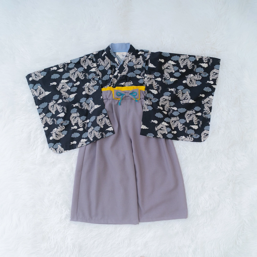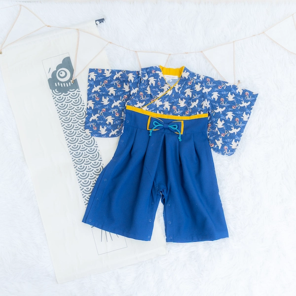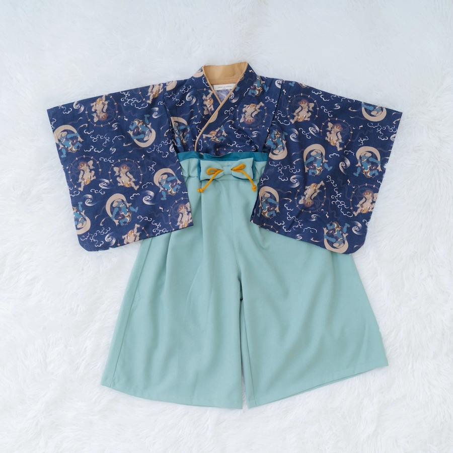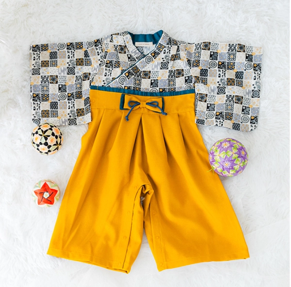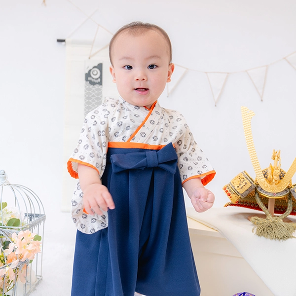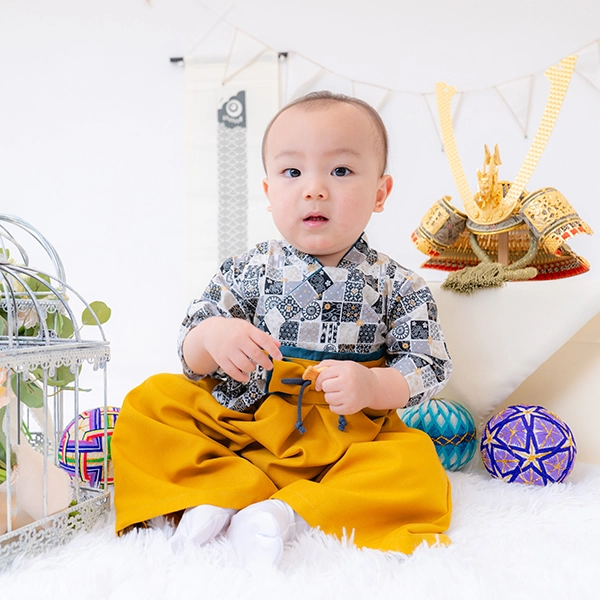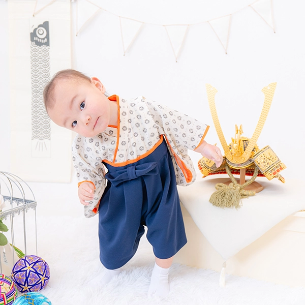 衣装には、petit mainの新作袴カバーオールとかぶと帽子をご用意。