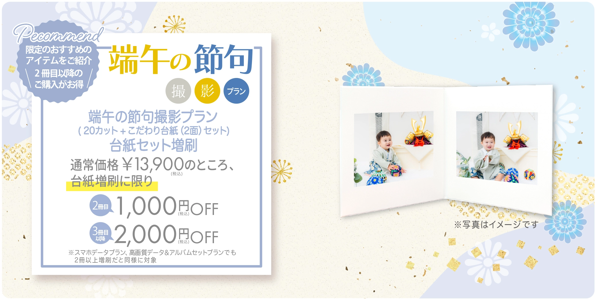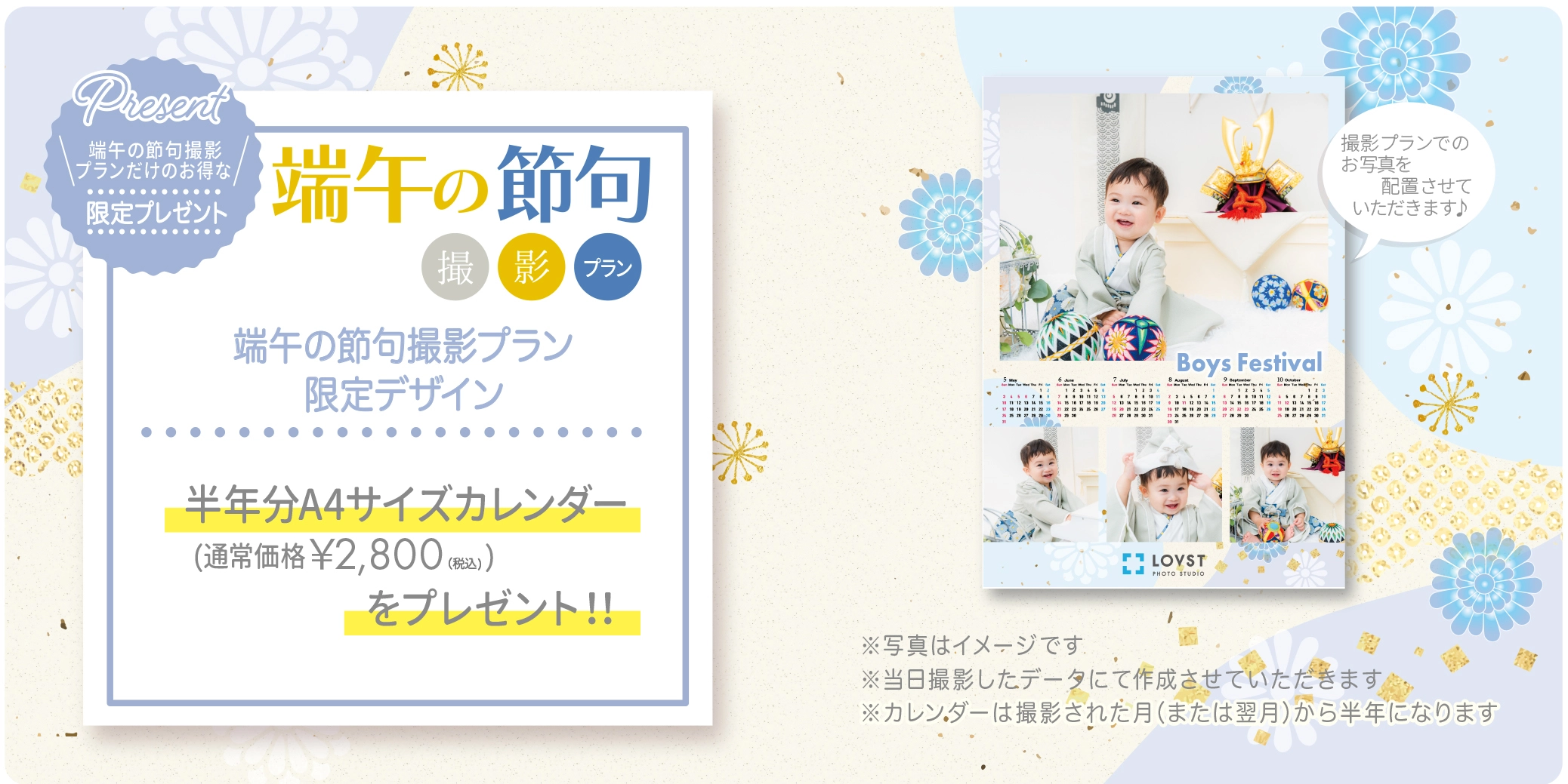 キャンペーン期間中の撮影で、端午の節句限定デザイン半年分A4サイズカレンダーをプレゼント!